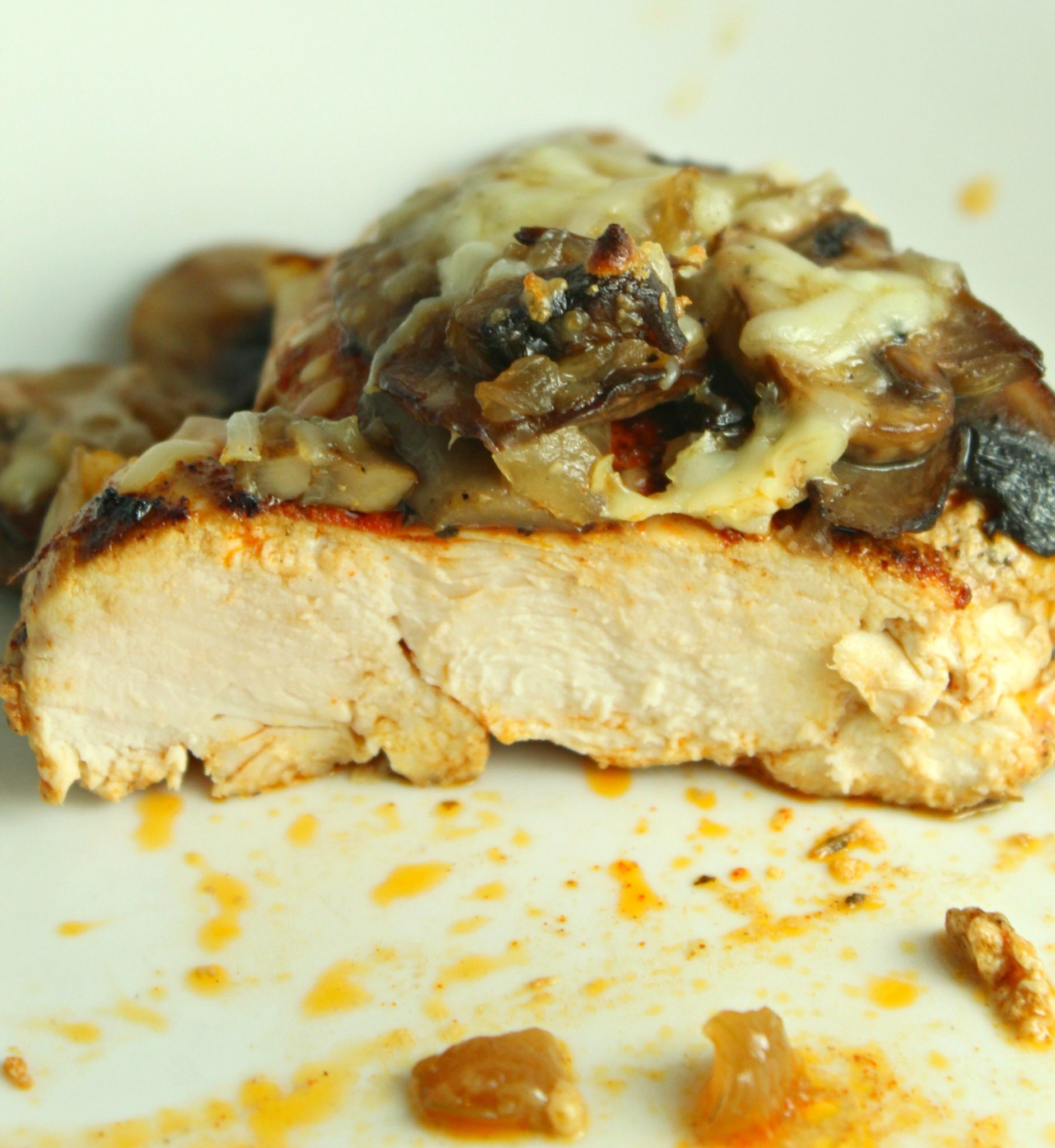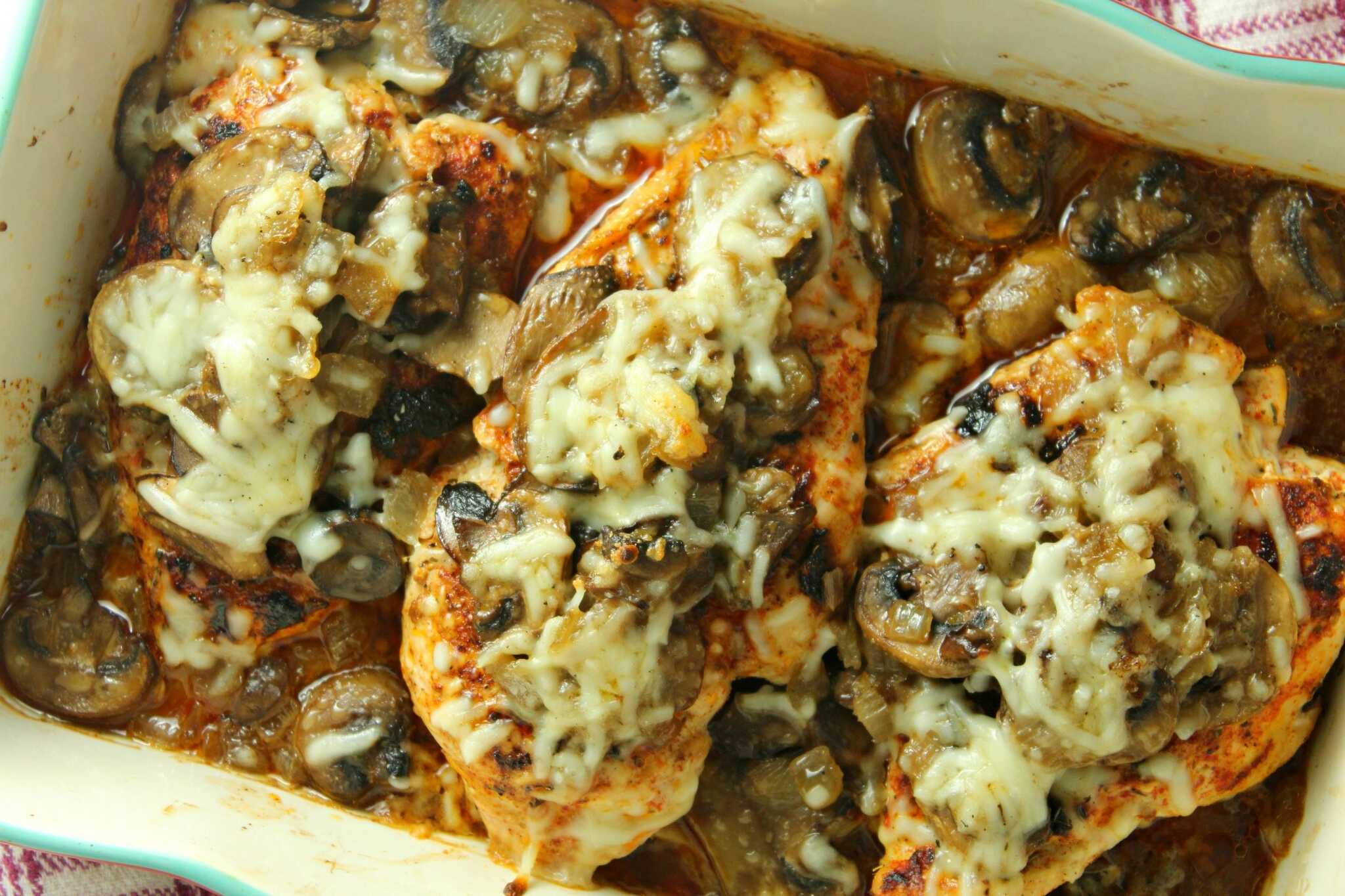 Προσθέστε το υπόλοιπο μίγμα μανιταριών / κρεμμυδιών πάνω από τα στήθη κοτόπουλου, πασπαλίζετε με τυρί μοτσαρέλα και ρίχνετε το ζωμό κοτόπουλου από πάνω.