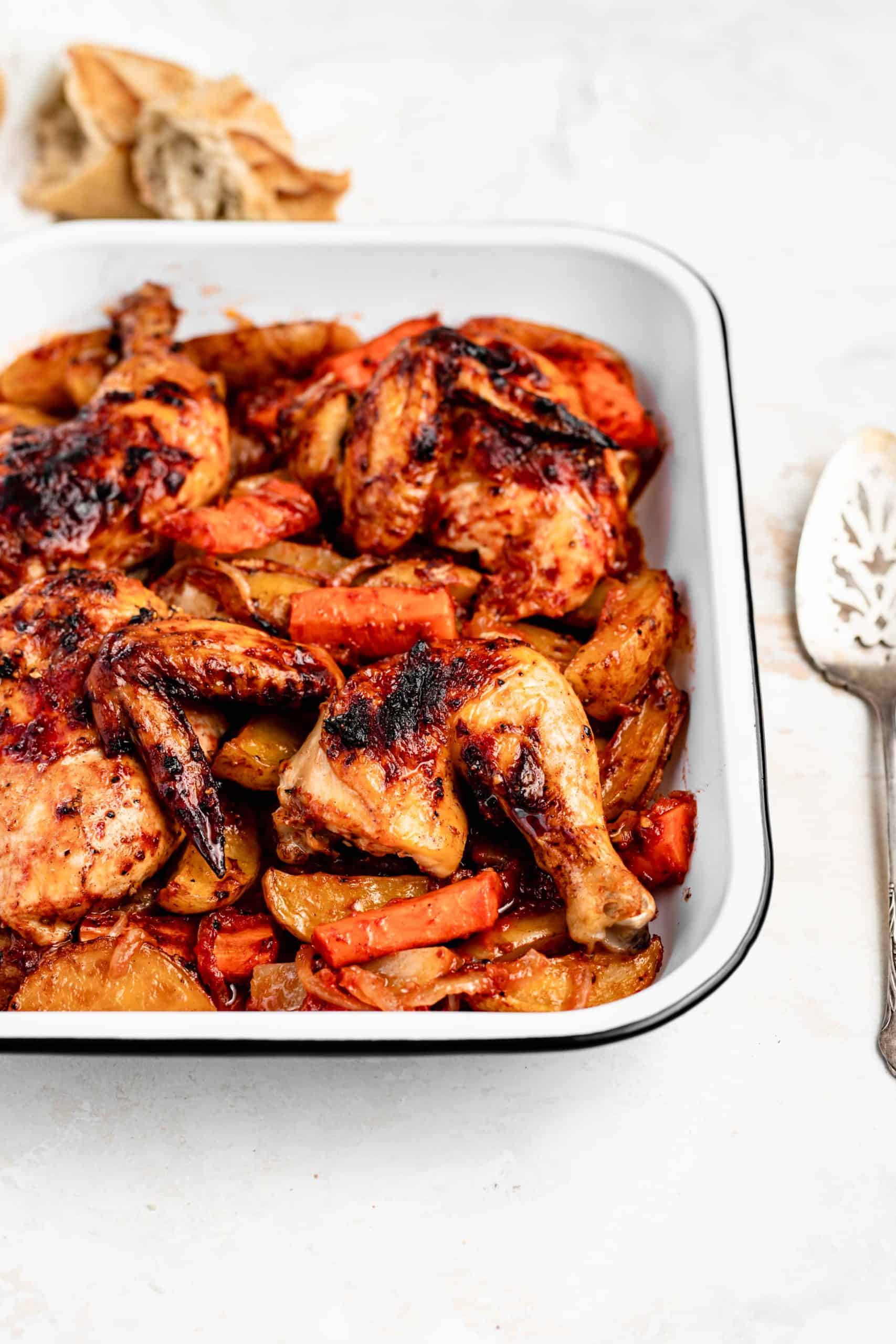 Προσθέστε τις πατάτες, τα καρότα και τα κρεμμύδια στο ταψί. Βεβαιωθείτε ότι χρησιμοποιείτε ένα αρκετά μεγάλο ταψί έτσι ώστε όλα τα λαχανικά να είναι σε ένα μόνο στρώμα. Κάνετε χώρο όπου θα τοποθετήσετε το κοτόπουλο, και στη συνέχεια προσθέστε το κοτόπουλο στο ταψί.