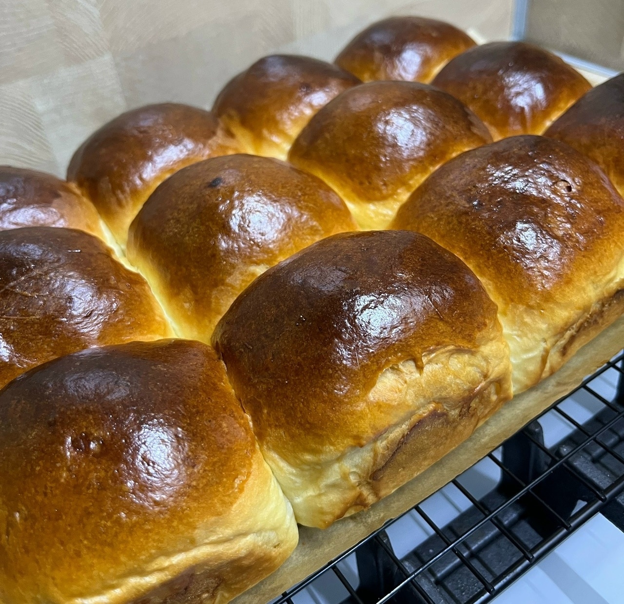 Ένα ταψί γεμάτο με ροδοκόκκινα, αφράτα στρογγυλά ψωμάκια που μόλις βγήκαν από τον φούρνο.