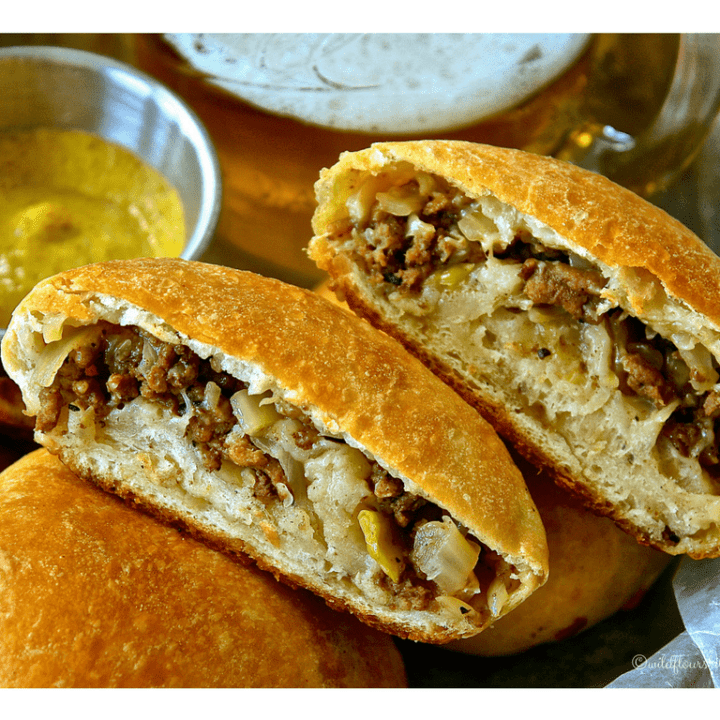 Ενώ η ζύμη φουσκώνει, ετοιμάστε την γέμιση. Σωτάρετε το κιμά και το κρεμμύδι και στη συνέχεια προσθέστε το αλάτι και το λάχανο. Μαγειρέψτε το λάχανο μέχρι να μαλακώσει, στη συνέχεια αφήστε το στην άκρη μέχρι να το χρησιμοποιήσετε.