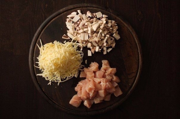 1. Κόβουμε το φιλέτο κοτόπουλου σε μικρούς κύβους, τα μανιτάρια σε μικρούς κύβους.