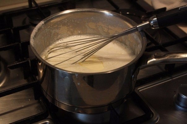 4. Ετοιμάζουμε τη σάλτσα μπεσαμέλ. Ζεσταίνουμε το γάλα, προσθέτουμε το αλεύρι με μια κουταλιά της σούπας και ανακατεύουμε με ένα σύρμα για να μην σχηματιστούν σβώλοι.