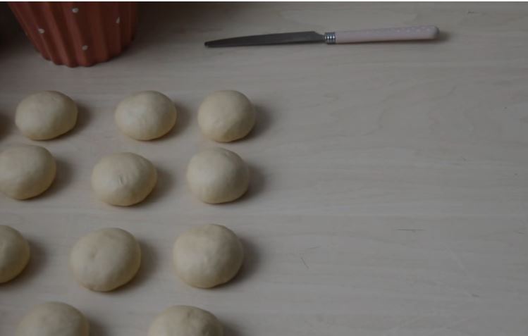 Ζυμώνουμε πάλι την ζύμη μας και φτιάχνουμε ένα μπαστούνι το οποίο το κόβουμε σε 10 ίσα μέρη.