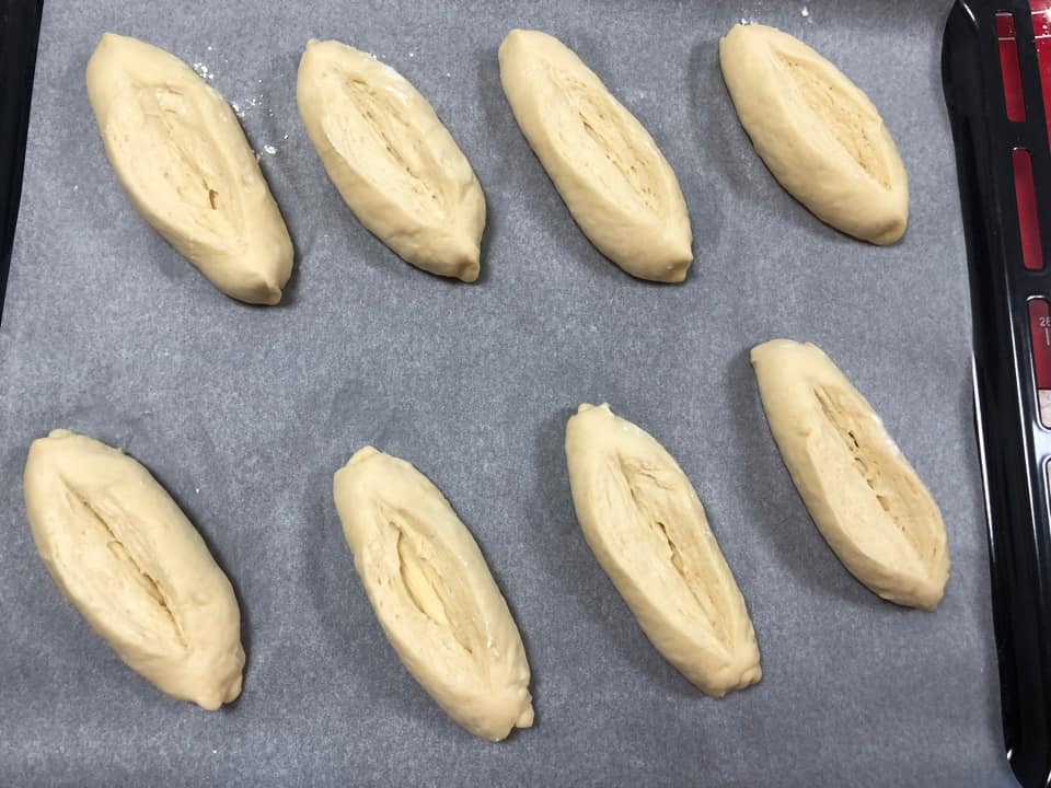 Παίρνουμε μια μπάλα και με τις παλάμες μας σχηματίζουμε ένα οβάλ σχημα από τη ζύμη. Στη συνέχεια το τυλίγουνε σε ρολό και το βάζουμε με τη ραφή προς τα κάτω