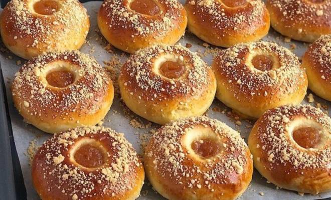 7) Στη συνέχεια αλείφουμε τα ψωμάκια με κρόκο + 2 κουτ. νερό, πασπαλισμένο με ψίχουλα. Μετά, με τη βοήθεια μιας σακούλας ζαχαροπλαστικής, γέμισα