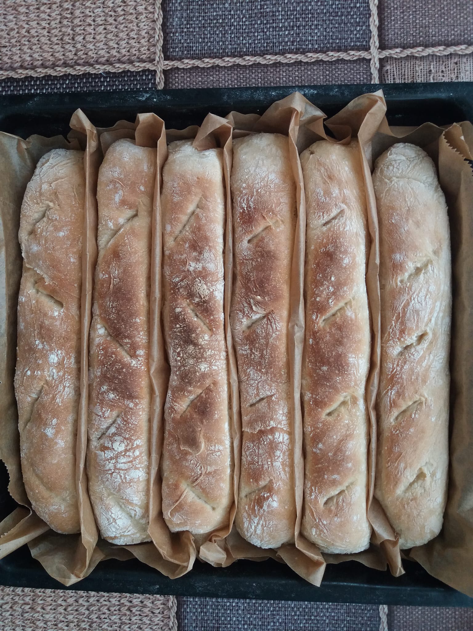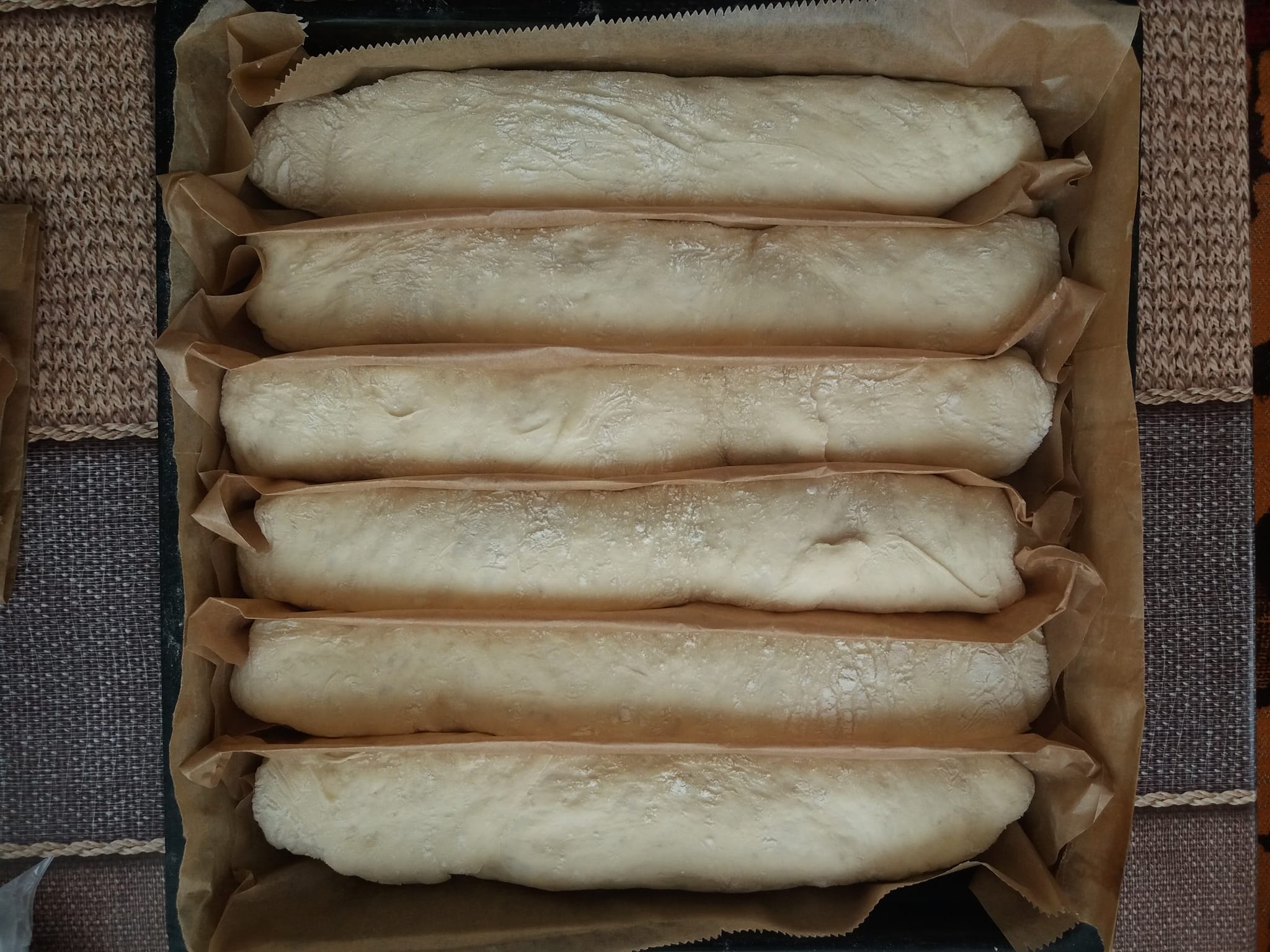 Θα χρειαστείτε δύο φύλλα χαρτιού. Σκεπάζουμε και αφήνουμε να φουσκώσει. Προθερμαίνουμε τον φούρνο στους 230 βαθμούς και βάζουμε ένα μπολ με νερό στον πάτο. Με ένα κοφτερό μαχαίρι κάνουμε τομές στα ψωμιά και ψήνουμε μέχρι να γίνουν.