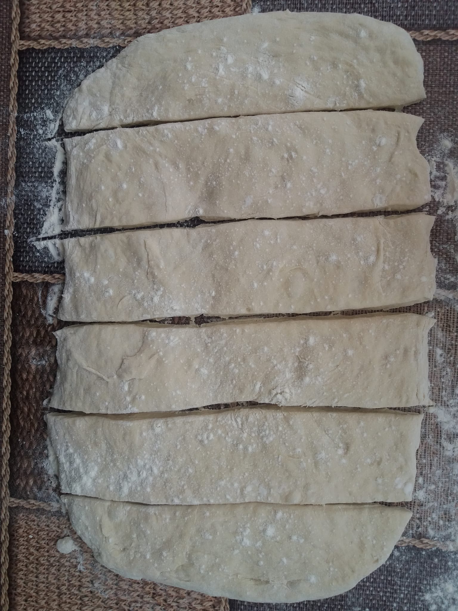 Κόβουμε τη ζύμη σε 6 μέρη και τεντώνουμε το καθένα ώστε να φτάσει στο μέγεθος του ταψιού του φούρνου.