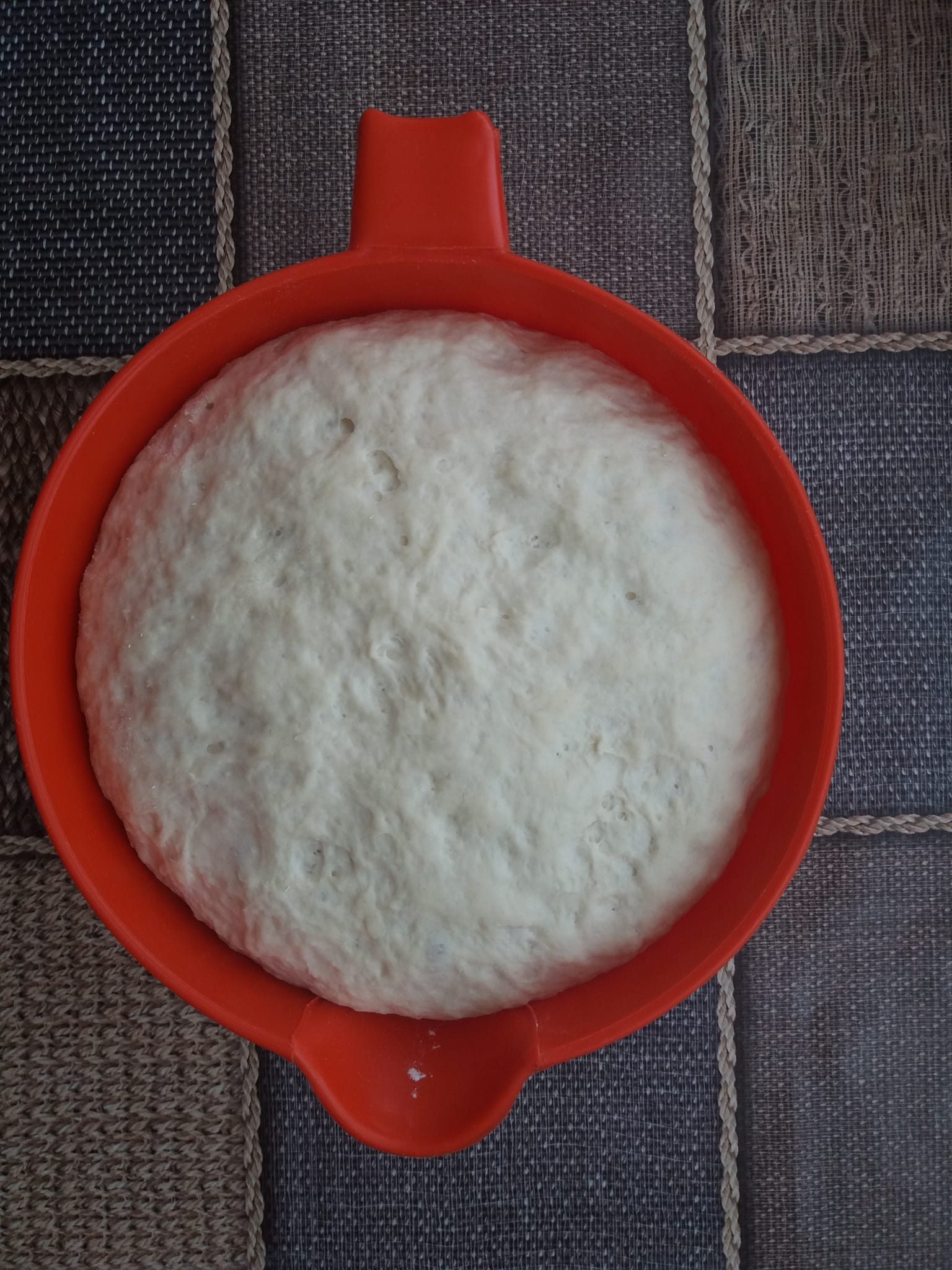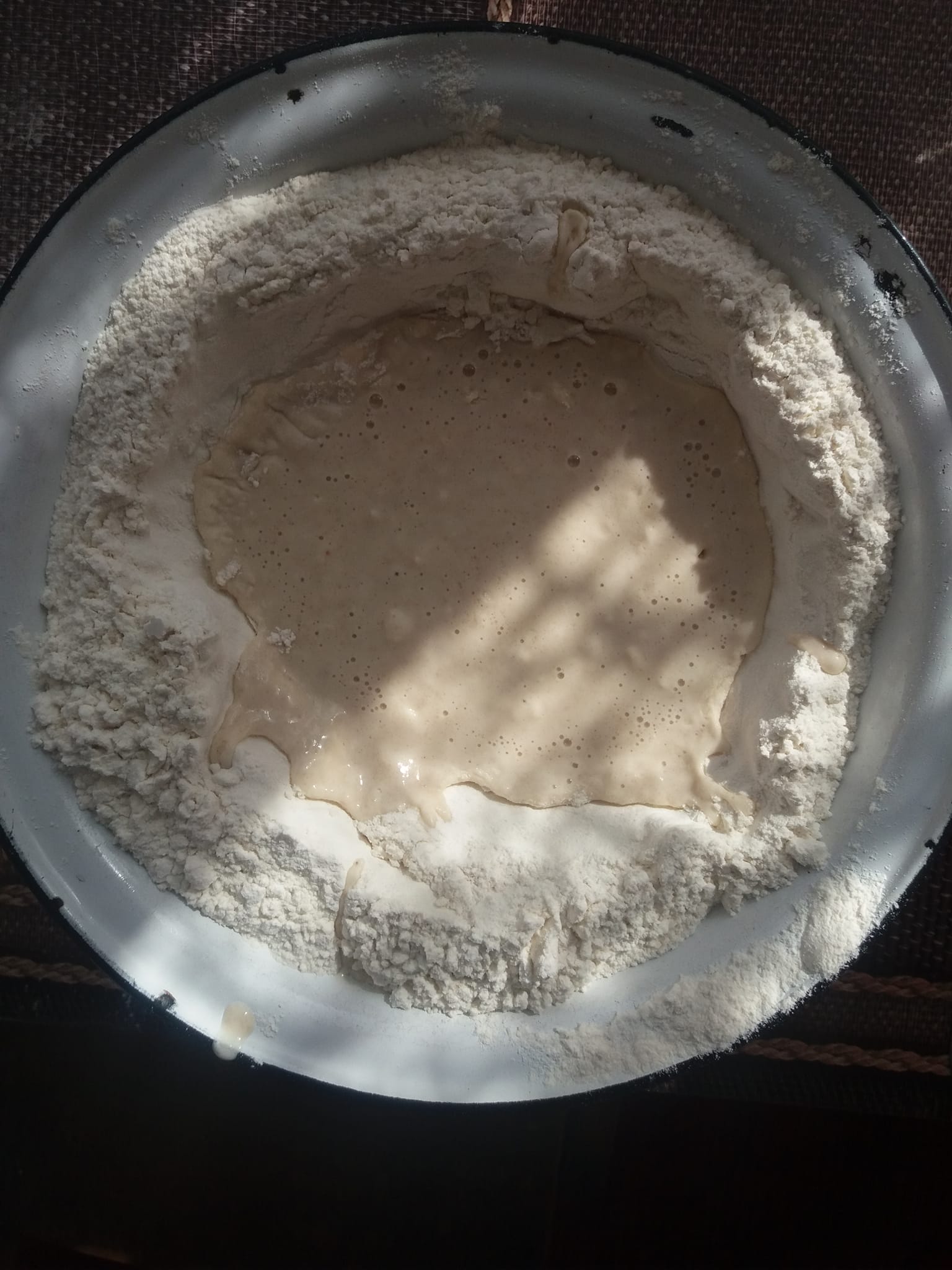 Ρίχνουμε τη ζύμη που έχουμε ζυμώσει σε μια πιατέλα πασπαλισμένη με αλεύρι. Πασπαλίζουμε από πάνω τη ζύμη και το αλεύρι και πιέζουμε ελαφρά με τα δάχτυλά μας να σχηματιστεί ένα μικρό παραλληλόγραμμο.