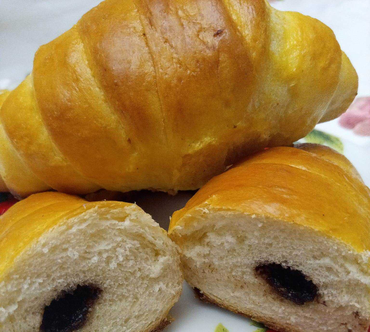 Παίρνουμε 1 μέρος της ζύμης, την ανοίγουμε σε κύκλο, την κόβουμε σε κομμάτια πάχους περίπου 1 εκ., βάζουμε στην άκρη μια κουταλια νουτέλα, τα τυλίγουμε σε ρολο.