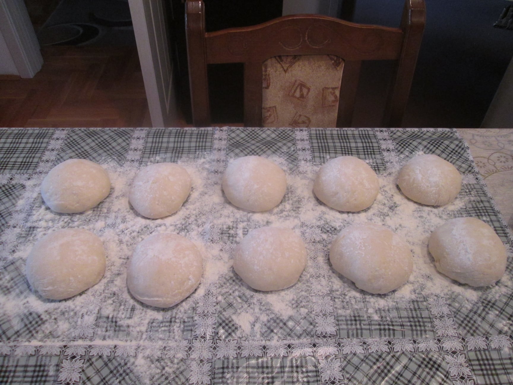 2. Επιμήκυνση της ζυμωμένης ζύμης σε σχήμα ρολού και διαίρεση της σε 10 μέρη. Φτιάξτε μία μπάλα από κάθε κομμάτι.