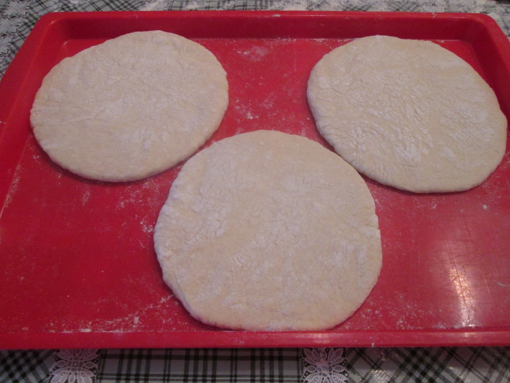 3. Ανάψτε το φούρνο για να ζεσταθεί στους 250 βαθμούς, μαζί με τη σχάρα που βρίσκεται μέσα σε αυτό. Πάρτε τρεις μπαλες (ο τελευταίος γύρος θα είναι τέσσερις) και ανοίξτε απαλά σε ψωμάκια πάχους 5 mm.