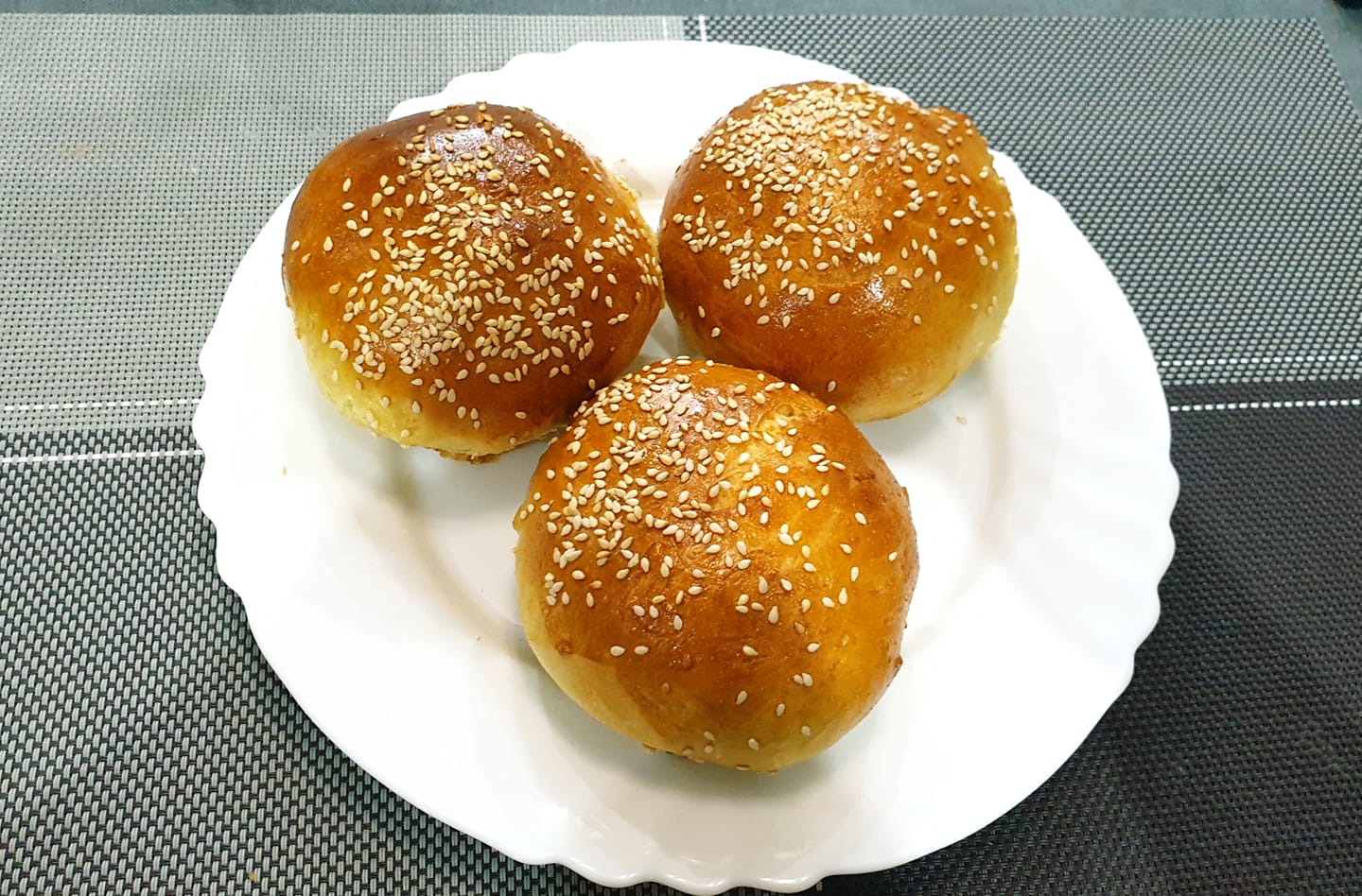 Τα έτοιμα ψωμάκια αλείφονται με 1 χτυπημένο αυγό και πασπαλίζονται με σουσάμι.