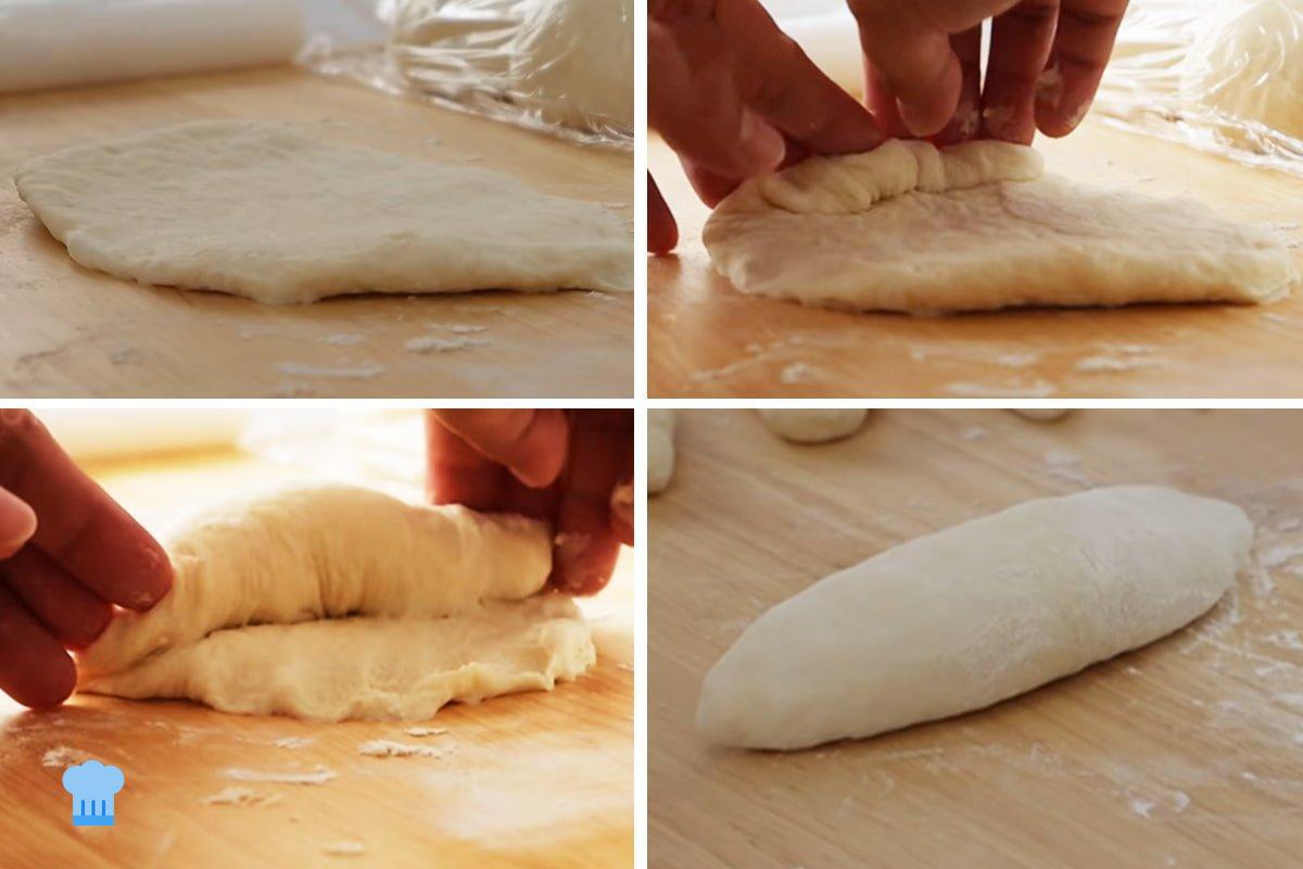 Μετά από 15 λεπτά, με τη σειρά, απλώστε ελαφρά κάθε μπάλα με έναν πλάστη. Στη συνέχεια τα στρίβουμε σε ένα είδος μακρόστενου ψωμάκι, όπως στην παρακάτω φωτογραφία.