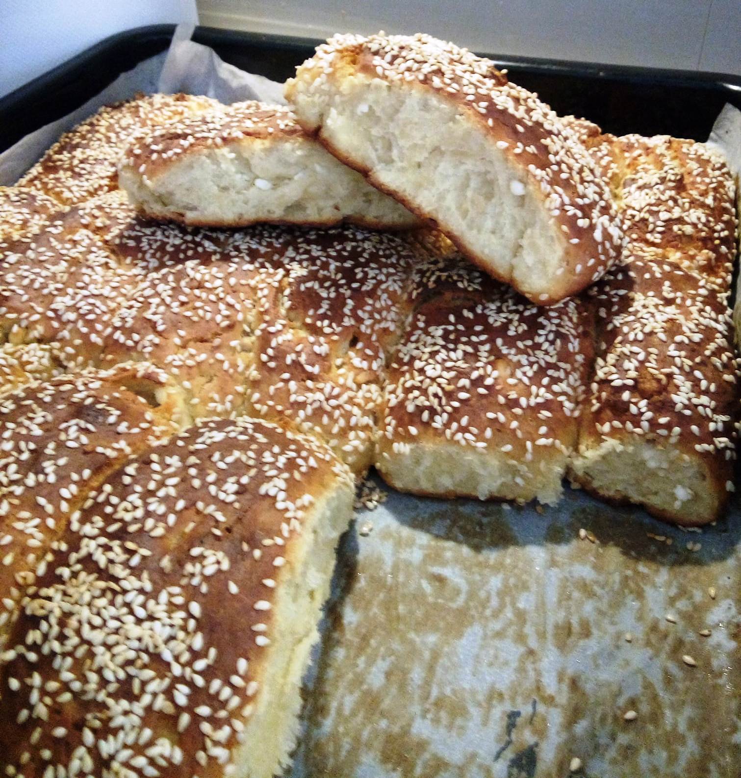 Κανουμε ψωμάκια τα τοποθετουμε σε λαδωμενο ταψάκι ριχνουμε σουσαμι και αφηνουμε 1 τεταρτο.