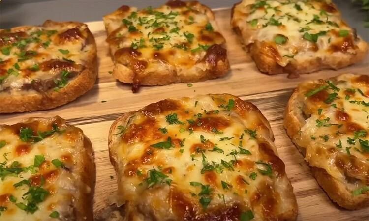 Τώρα το μοιράζουμε σε κομμάτια ψωμιού. Πασπαλίζουμε το καθένα με τριμμένο τυρί και το βάζουμε σε προθερμασμένο φούρνο