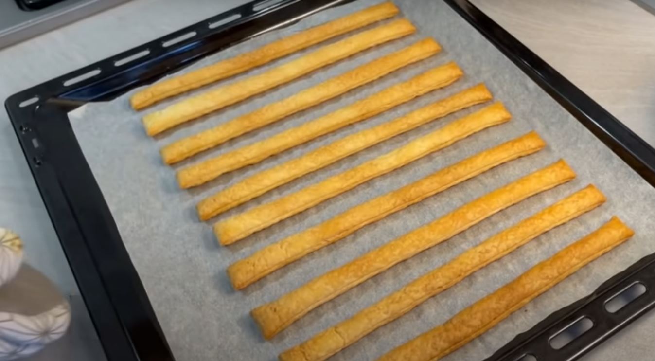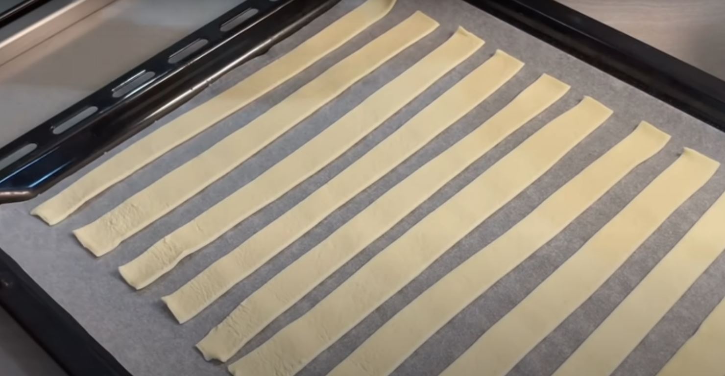Ξεκινάμε το γλυκό μας ανοίγουμε τη σφολιάτα επάνω στον πάγκο μας και κόβουμε σε λωρίδες των 2 εκατοστών στησυνέχεια τοποθετούμε τις λωρίδες σφολιάτας σε ένα ταψί φούρνο που έχουμε στρώσει με χαρτί ψησίματος σε απόσταση περίπου 1 με 2 cm σε κάθε λωρίδα και ψήνουμε για 10 λεπτά στους 200 βαθμούς.