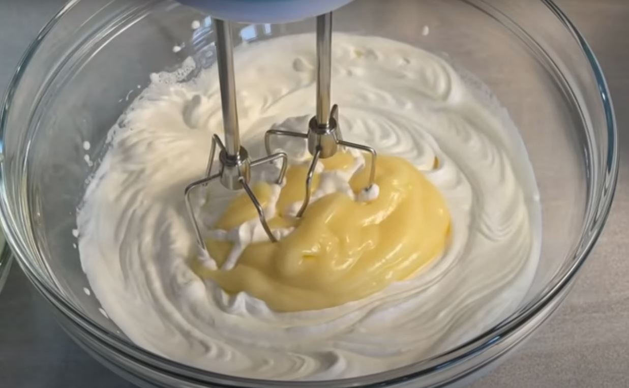 Βγάζουμε την κρέμα από το ψυγείο και τη ρίχνουμε μέσα στη σαντιγί κουταλιά-κουταλιά ενώ χτυπάμε με το μίξερ για να ενσωματωθεί και συνεχίζουμε έως ότου εξαντληθεί όλη η κρέμα.