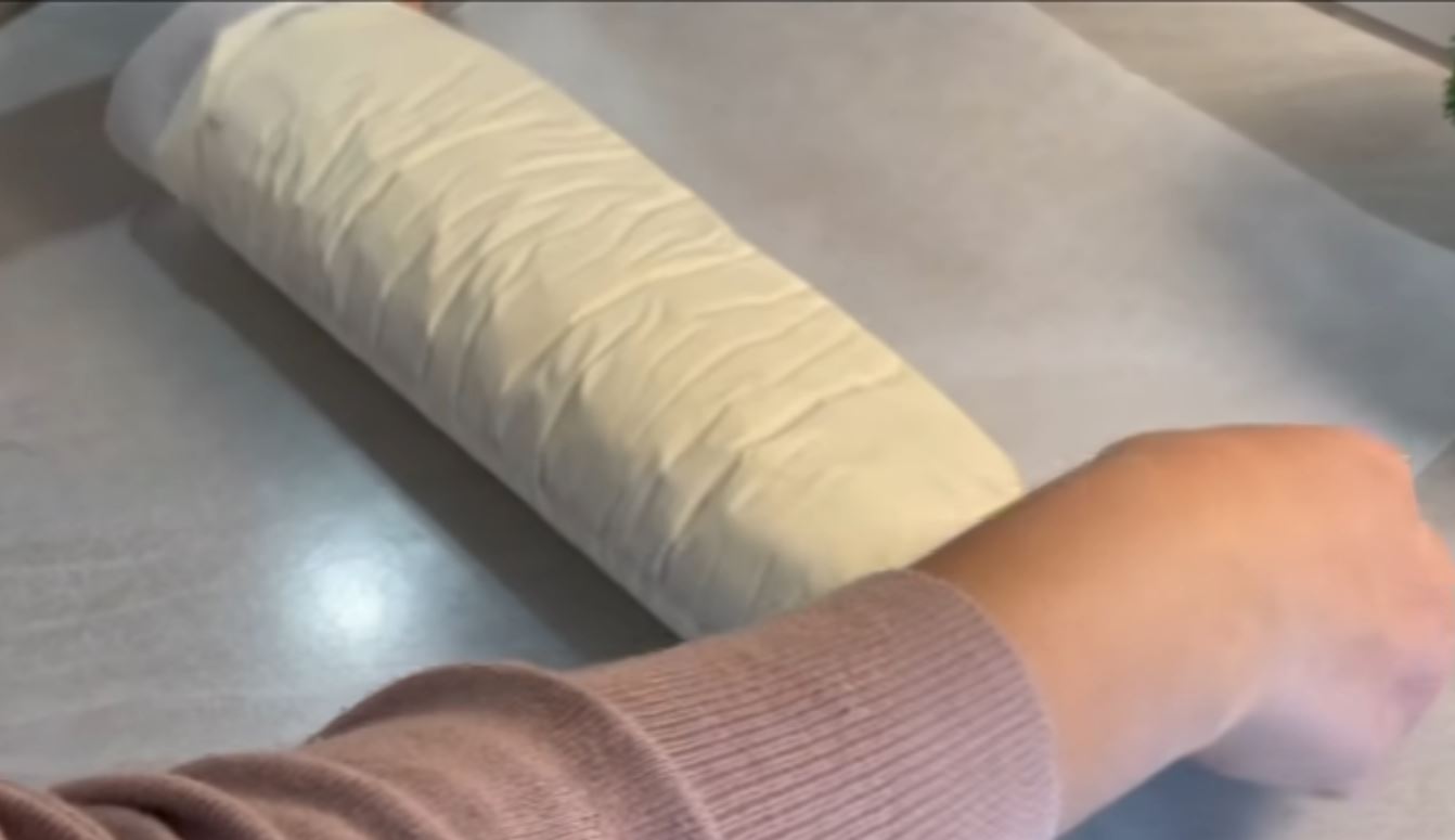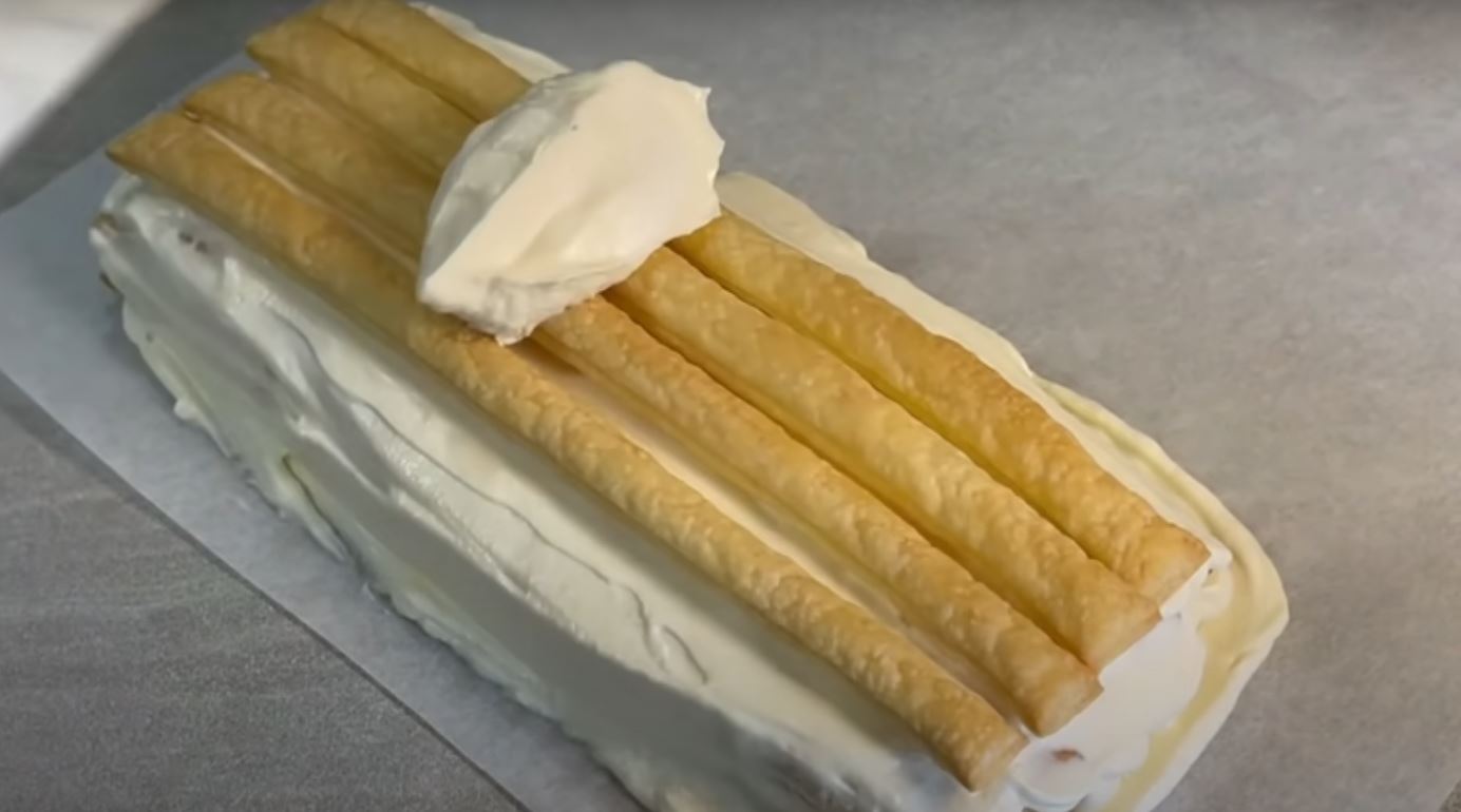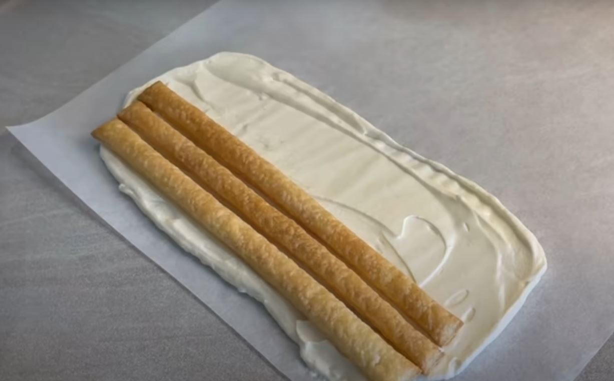 Στρώνουμε μία λαδόκολλα στον πάγκο μας και απλώνουμε τρεις κουταλιές της κρέμας σε ένα παραλληλόγραμμο τοποθετούμε επάνω στην κρέμα 6 από τις ψημένες ράβδους σφολιάτας κολλητά η μία στην άλλη και από πάνω ξανά τοποθετούμε πάλι κρέμα.