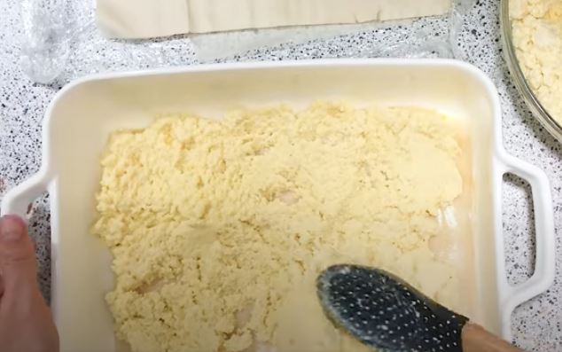 Στρώνω στην βάση 2 φύλλα και τα βουτυρώνω ενδιάμεσα και απλώνω το 1/3 της γέμισης.