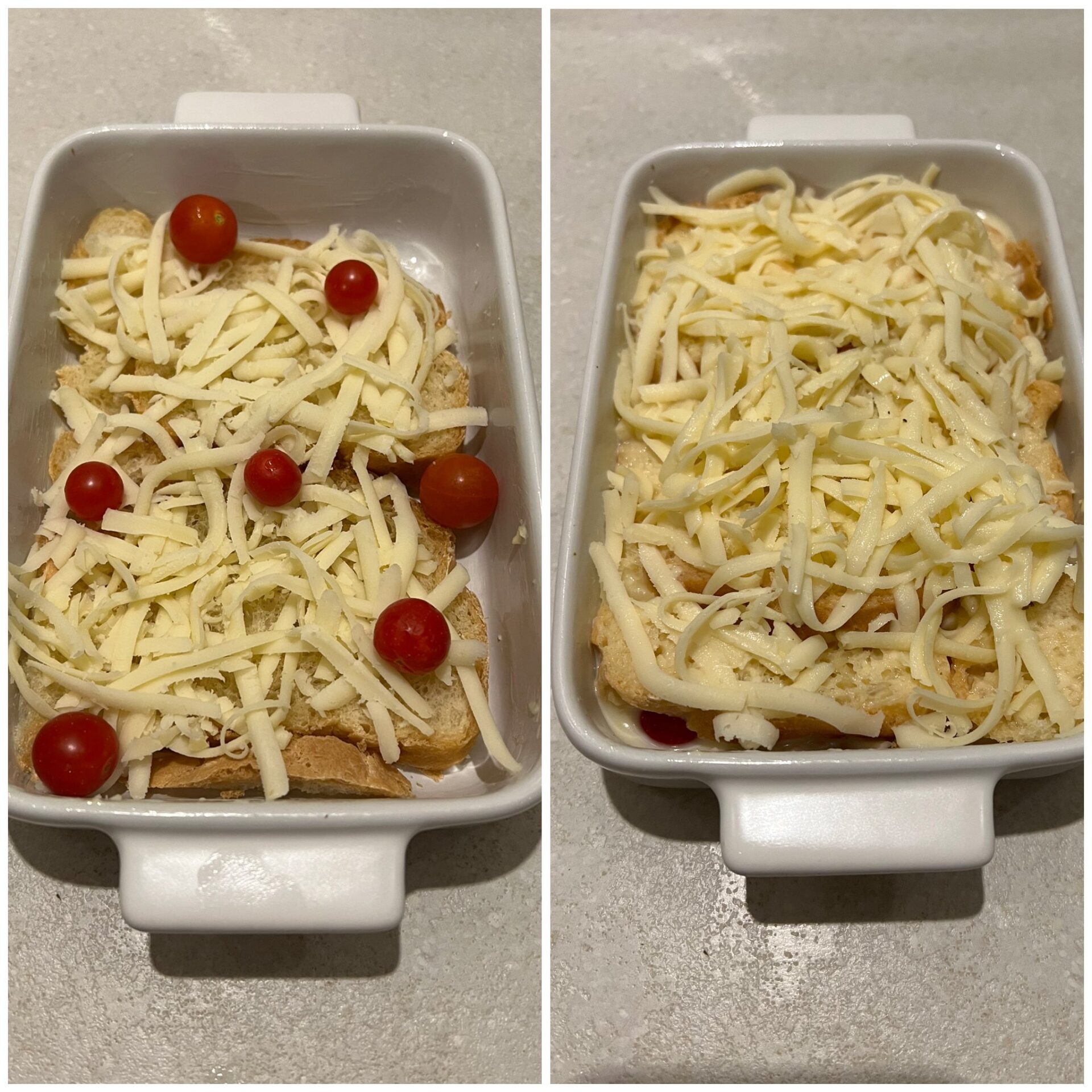 Αλείφω ένα ταψί με βούτυρο. Κόβω τις φέτες του ψωμιού και τις αραδιάζω στον πάτο της φόρμας, προσπαθώντας να μην αφήσω κενά. Πασπαλίζω με το μισό τριμμένο τυρί. Αν θέλω, τοποθετώ τα ντοματίνια σε φέτες. Προσθέτω άλλη μία στρώση ψωμιού.