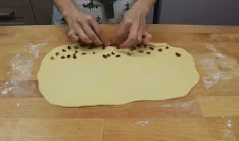Πασπαλίζουμε στην μακριά πλευρα της ζύμης με σταφίδες μεχρι την μέση.