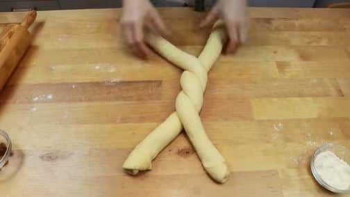 Πλέκουμε τα δύο κορδόνια ζύμης σε μια πλεξούδα