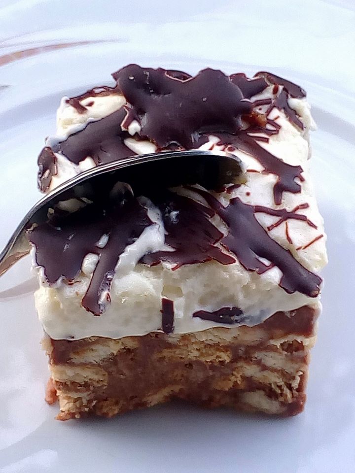 Ανακατεύουμε ζωηρά και μόλις πήξει,κατεβάζουμε την κατσαρόλα από την φωτιά. Ρίχνουμε την βανίλια και τα μπισκότα,ανακατεύουμε και αδειάζουμε σε κουμπωτή φόρμα.