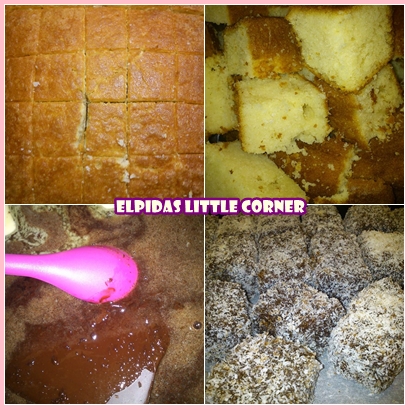 Κόβουμε σε τετράγωνα το γλυκό,το βουτάμε στο χλιαρό σιρόπι και μετά στο ινδοκάρυδο.