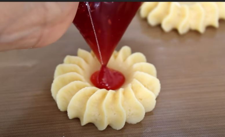 Σε μία σακούλα κορνέ προσαρμόζουμε το στόμιο που θέλουμε και την γεμίζουμε με το μείγμα και φτιάχνουμε τα σαμπλεδάκια σε ότι σχήμα θέλουμε ανάλογα με τα στομια που έχουμε