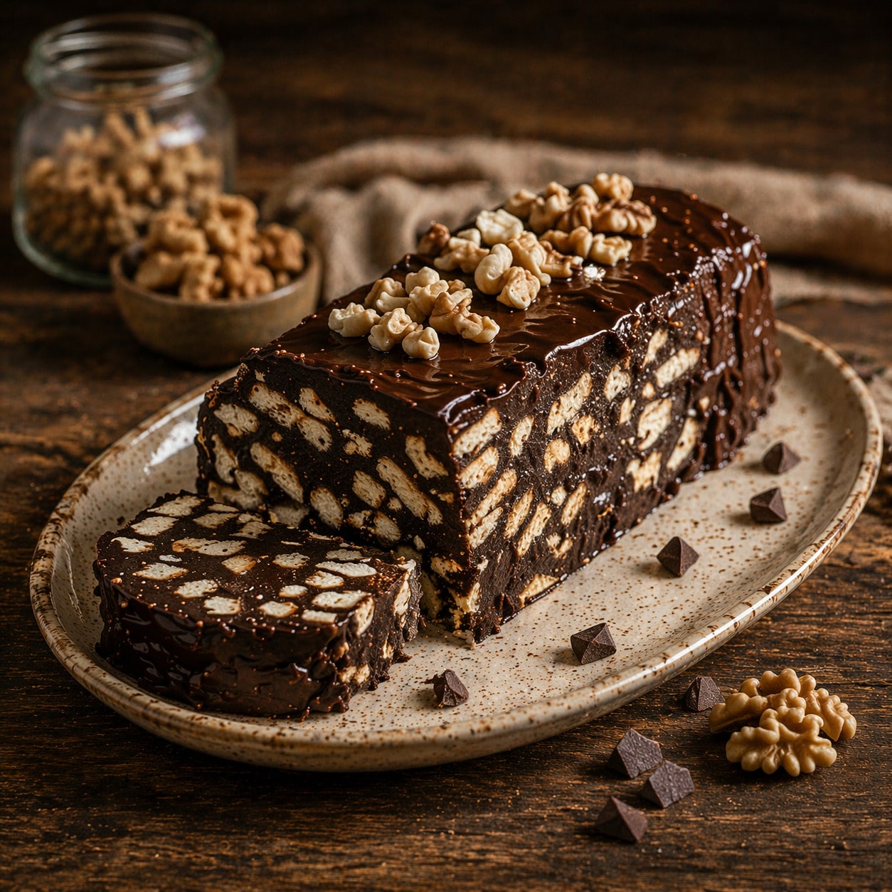 Απόσυρε από τη φωτιά και άφησε να κρυώσει 5 λεπτά πριν ρίξεις τα μπισκότα — αν το μείγμα είναι πολύ καυτό τα λιώνει εντελώς και χάνεις την τραγανή υφή. Σπάσε τα μπισκότα σε ανόμοια κομμάτια — μην τα κάνεις σκόνη: θέλεις να νιώθεις τα κομματάκια στο τελικό γλυκό. Ρίξε τα μπισκότα στο σοκολατένιο μείγμα και ανακάτεψε απαλά. Πρόσθεσε ξηρούς καρπούς αν θέλεις. Απόθεσε σε λαδόκολλα και τύλιξε σε ρολό ή πίεσε σε ταψί. Ψύξε 3–4 ώρες.