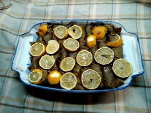 Ψιλοκόβουμε όλα τα υλικά μας και τά βάζουμε στήν κατσαρόλα με το λάδι νά τά σωτάρουμε. Στήν συνέχεια ρίχνουμε το ρύζι και το σωτάρουμε και αυτό γιά ένα λεπτό. Τέλος ρίχνουμε 1-2 ποτήρια νερό και το ανακατεύουμε μέχρι νά το τραβήξει και το κατεβάζουμε από την φωτιά γιά να ξεκουραστεί. Δεν θέλουμε να βράσει το ρυζι. Πλένουμε τα αμπελόφυλλα καλά τα κάνουμε ματσάκι και τα ζεματίζουμε σε βραστό νερό για ένα λεπτό. Απλώνουμε σε καθαρό πάγκο τα φύλλα και βάζουμε μία κουταλιά του γλυκού γεμάτη με γέμιση και τα τυλίγουμε. Τα τοποθετούμε στο ταψί με την σειρά και από πάνω βάζουμε ψιλοκομμένες φέτες λεμονιού. Τα καλύπτουμε ίσα ίσα με νερό βάζουμε το λάδι το αλάτι. Τά αφήνουμε να ψηθούν σέ χαμηλή φωτιά μέχρι να σωθεί το νερό.