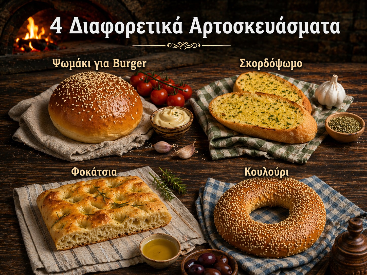 Από μαλακά ψωμάκια burger μέχρι το σφιχτό, μαστιχωτό κουλούρι— τέσσερα αρτοσκευάσματα που αποτελούν τη βάση κάθε αρτοποιείου και café. Με τις σωστές τεχνικές και τον κατάλληλο τύπο αλευριού, το αποτέλεσμα θα είναι επαγγελματικής ποιότητας κάθε φορά!
