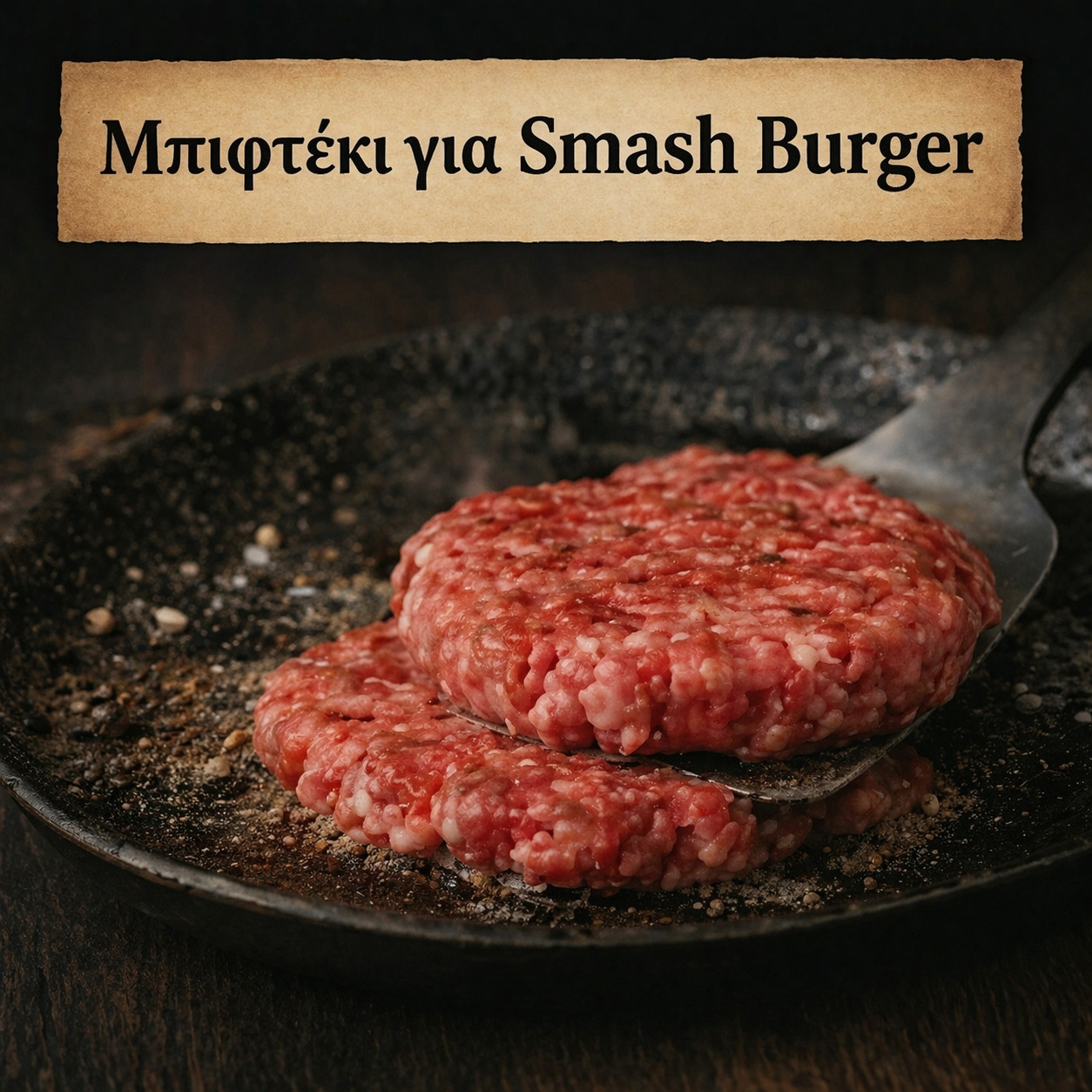 Το smash burger έχει εντελώς διαφορετική φιλοσοφία από το κλασικό: δεν θέλουμε παχύ μπιφτέκι αλλά λεπτό με μέγιστη επαφή με το καυτό τηγάνι. Χώρισε τον κιμά σε μπαλάκια 120–130 γρ. χωρίς να τα πλάσεις — απλά χαλαρά μπαλάκια. Αλάτισε μόνο εξωτερικά.