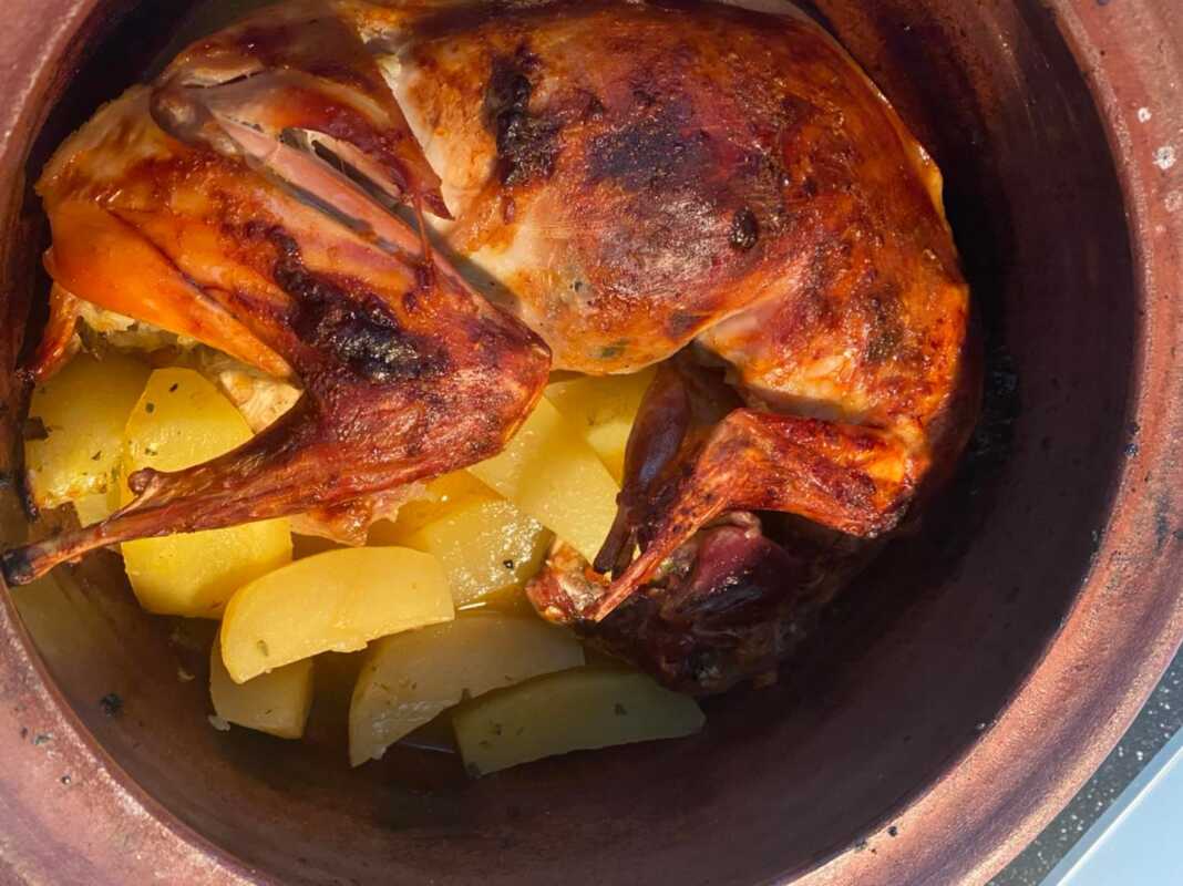 Αλείφω με λάδι απο πάνω το κουνέλι και στις πατάτες το υπολοιπο, πρόσθεσα κρασί και 2/3 ποτήρι ζεστό νερό και το βάζω στο φούρνο να ψηθεί σε χαμηλή φωτιά – 150 γρ βαθμόυς για 2 ώρες περίπου. Εάν δεν έχετε πήλινο σκεύος, μπορείτε να χρησιμοποιήσετε ένα ταψί και να τον καλύψετε με αλουμινόχαρτο.