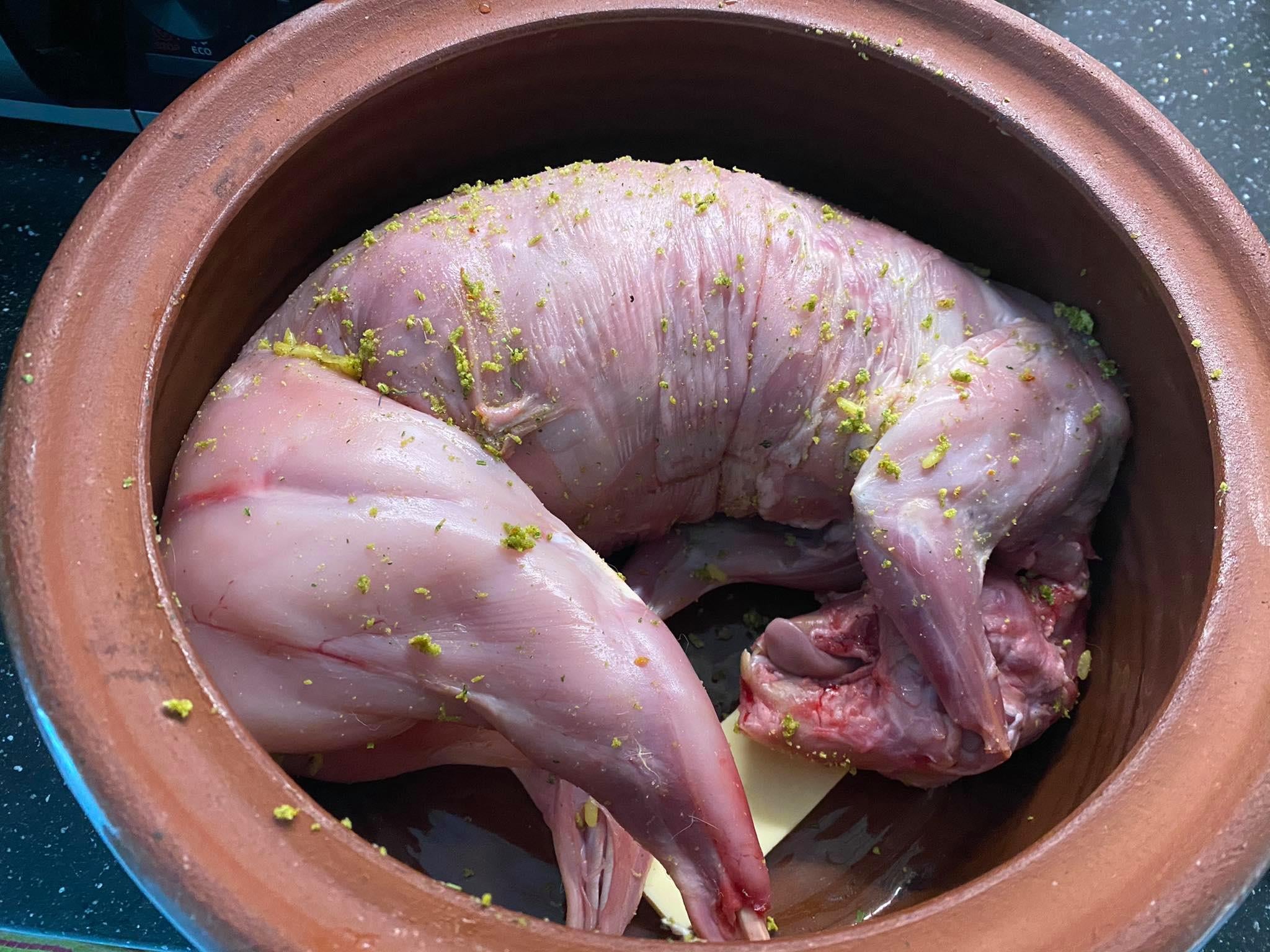 Αλείφω το κουνέλι εξωτερικά και μέσα με τον άλλο κύβο ζωμό κότας, γεμιζω με τη γέμιση, ράβω με την κλωστή και βελόνα και το βάζω σε πήλινο σκεύος.