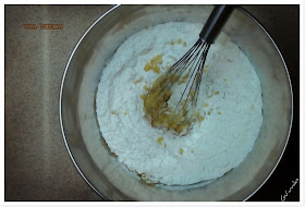 Αναμειγνύουμε τα στερεά υλικά της 2ης ομάδας και τα προσθέτουμε σταδιακά στο μπολ με τα υγρά ανακατεύοντας με μια σπάτουλα ή με το χέρι
