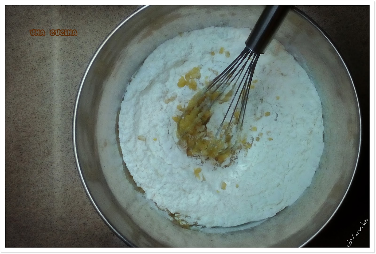 Αναμειγνύουμε τα στερεά υλικά της 2ης ομάδας και τα προσθέτουμε σταδιακά στο μπολ με τα υγρά ανακατεύοντας με μια σπάτουλα ή με το χέρι