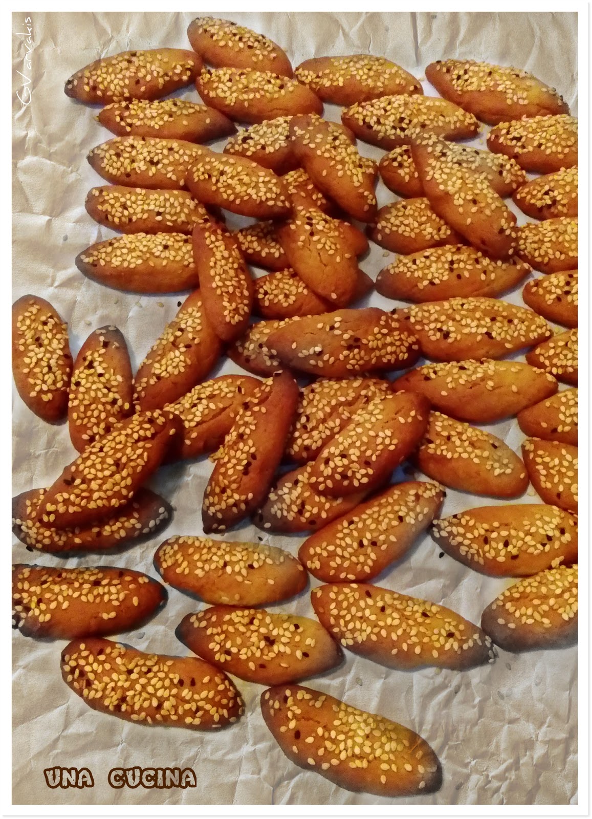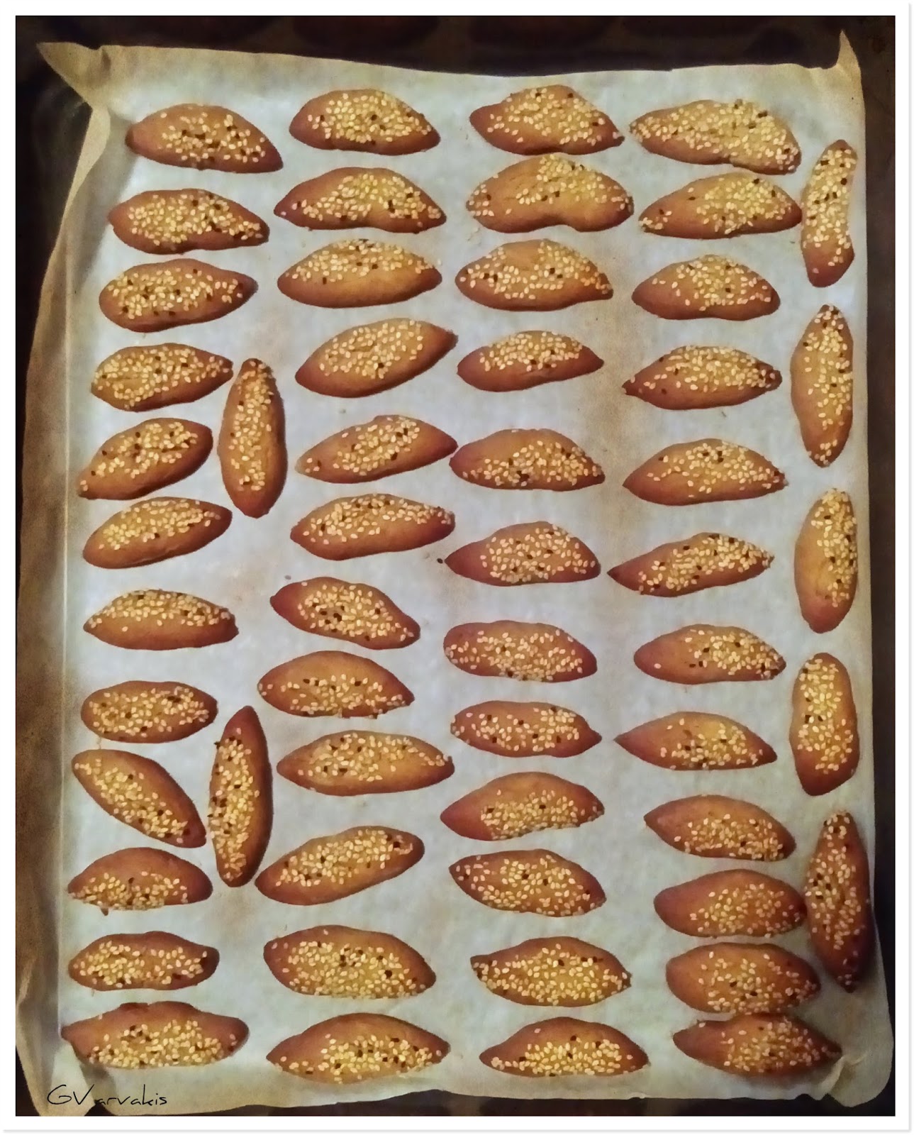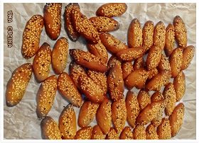 Πλάθουμε κουλουράκια στο μέγεθος που μας βολεύει, τα βουτάμε στο σουσάμι και τα βάζουμε στο ταψί πάνω σε λαδόκολλα