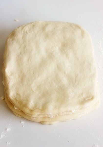 Με τα χέρια σας πιέζεται απαλά την ζύμη για να ανοίξει μέχρι να έχει διαστάσεις 28*40 εκατοστά περίπου.
