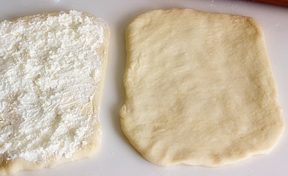 Χωρίζεται την ζύμη σας σε 4 μέρη και ανοίγεται το κάθε μέρος σε ομοιόμορφα ορθογώνια πάχους 1 εκατοστού. Αλείφεται την ζύμη με την μαργαρίνη και μετά βάζετε την φέτα