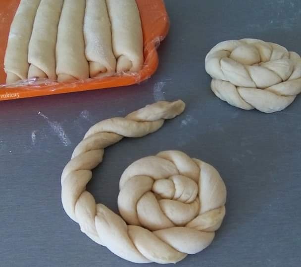 2 Πάρτε δύο ρολά, το καθένα μήκους περίπου 30-35 εκατοστώνι πλέξτε τα αλλάζοντας τα το ένα πάνω στο άλλο και τυλίξτε το σε σαλιγκάρι οπότε δουλέψτε με όλα τα ρολά