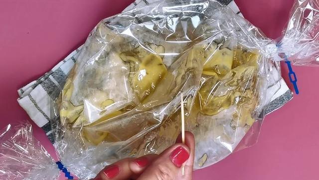 Κλεινουμε τις σακουλες, κανουμε τρυπηματα με μια οδοντογλυφιδα και στρωνουμε το βάζουμε στο φουρνου.