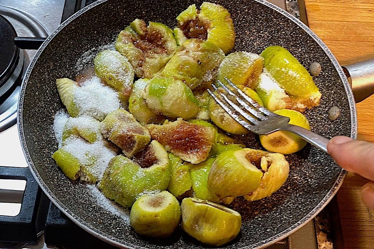 Βάλτε σύκα σε αντικολλητικό τηγάνι 24 εκ., προσθέστε 20 γραμμάρια ζάχαρης (1 κουταλιά της σούπας), βάλτε σε χαμηλή προς μέτρια φωτιά. Όταν αρχίσουν να απελευθερώνουν νερό ανακατεύουμε και πολτοποιούμε με ένα πιρούνι.
