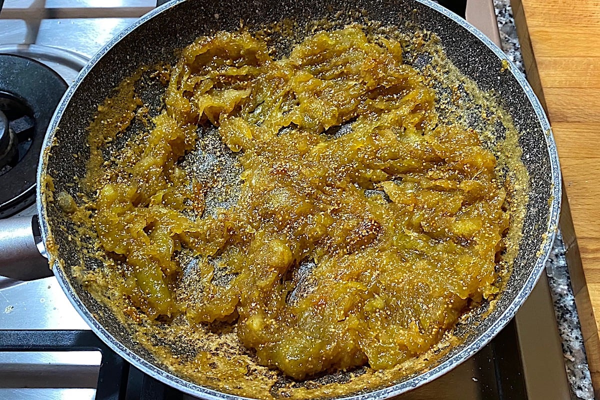 Συνεχίστε το μαγείρεμα, την πολτοποίηση και το ανακάτεμα μέχρι να στεγνώσει και να μετατραπεί σε μια πολύ παχιά πάστα. Θα διαρκέσει 20 έως 30 λεπτά. Πριν γίνουν πολύ παχιά, δοκιμάστε και αν το μείγμα δεν είναι αρκετά γλυκό προσθέστε 1 ή 2 κουταλιές της σούπας ζάχαρη. Σβήνουμε τη φωτιά και αφήνουμε να κρυώσει.