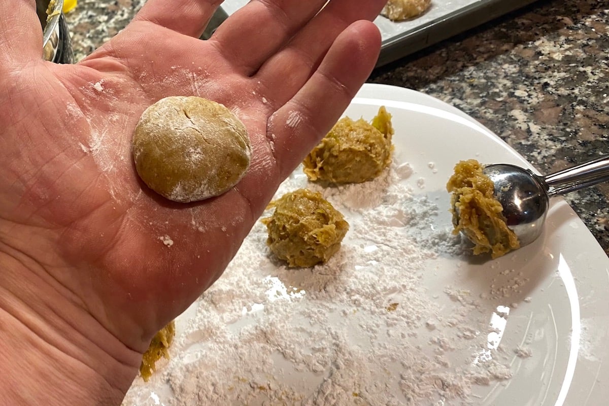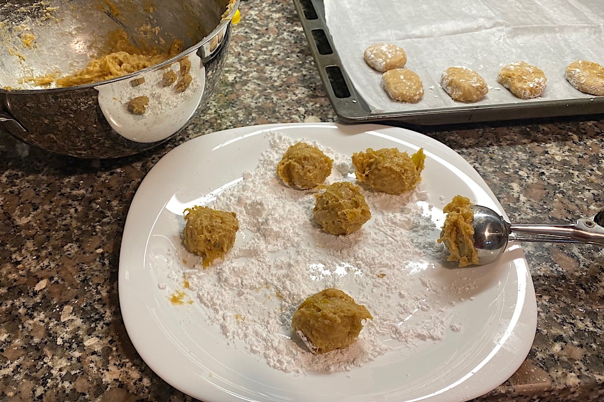 Όταν η ζύμη είναι έτοιμη, απλώνετε 2 κουταλιές της σούπας ζάχαρη άχνη σε ένα πιάτο. Πάρτε τη ζύμη με 1 ή 2 κουταλάκια του γλυκού, σχηματίστε μια μικρή μπάλα, ρίξτε τη ζάχαρη. Προσπαθήστε να κάνετε μπάλες στο ίδιο μέγεθος, να πάρετε 22-24 από αυτές.