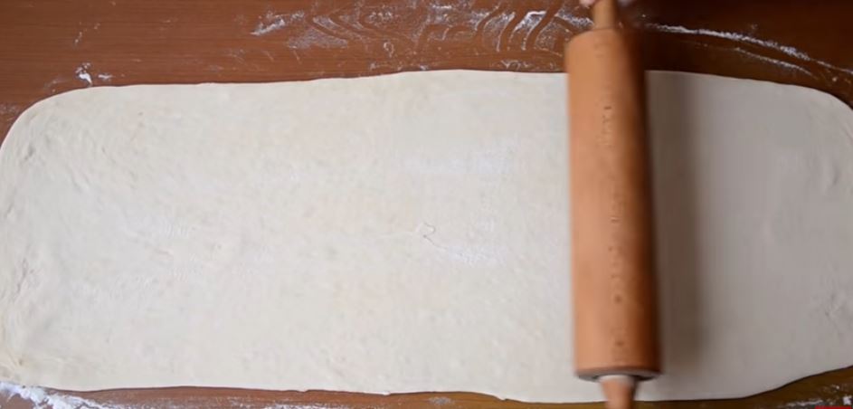 Αφού φουσκώσει την πλάθετε άλλα 5 λεπτά με τα χέρια ρίχνετε αρκετό αλεύρι στο τραπέζι και με τον πλάστη την ανοίγετε σε μακρόστενο φύλλο.