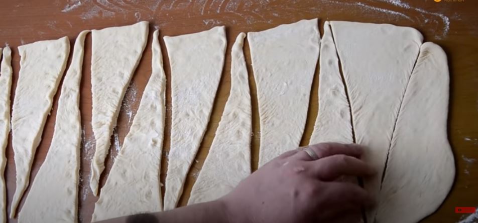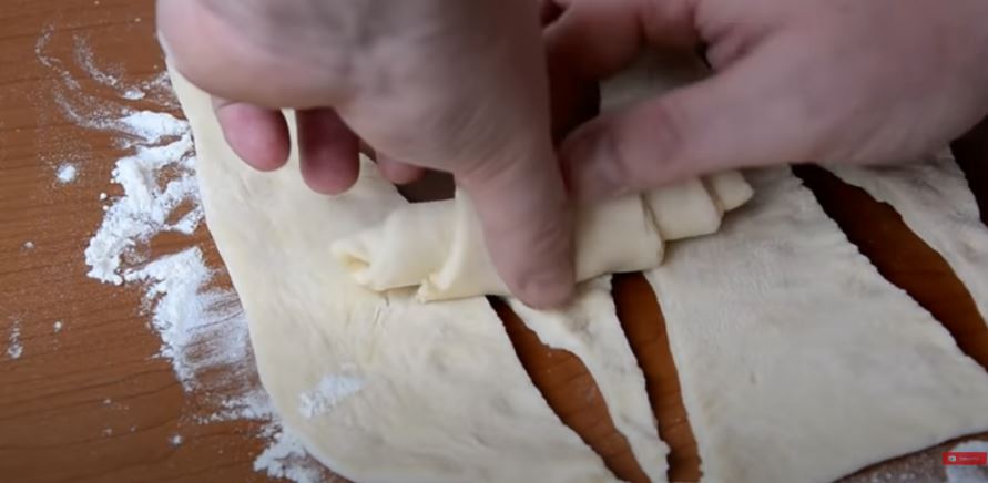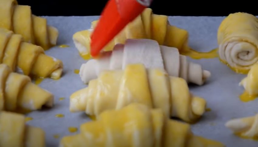 Την κόβετε σε τρίγωνα κομμάτια και τα τυλίγετε ρολάκια.Τα τοποθετείτε σε ταψί στο οποίο έχετε βάλει αντικολλητικό χαρτί.