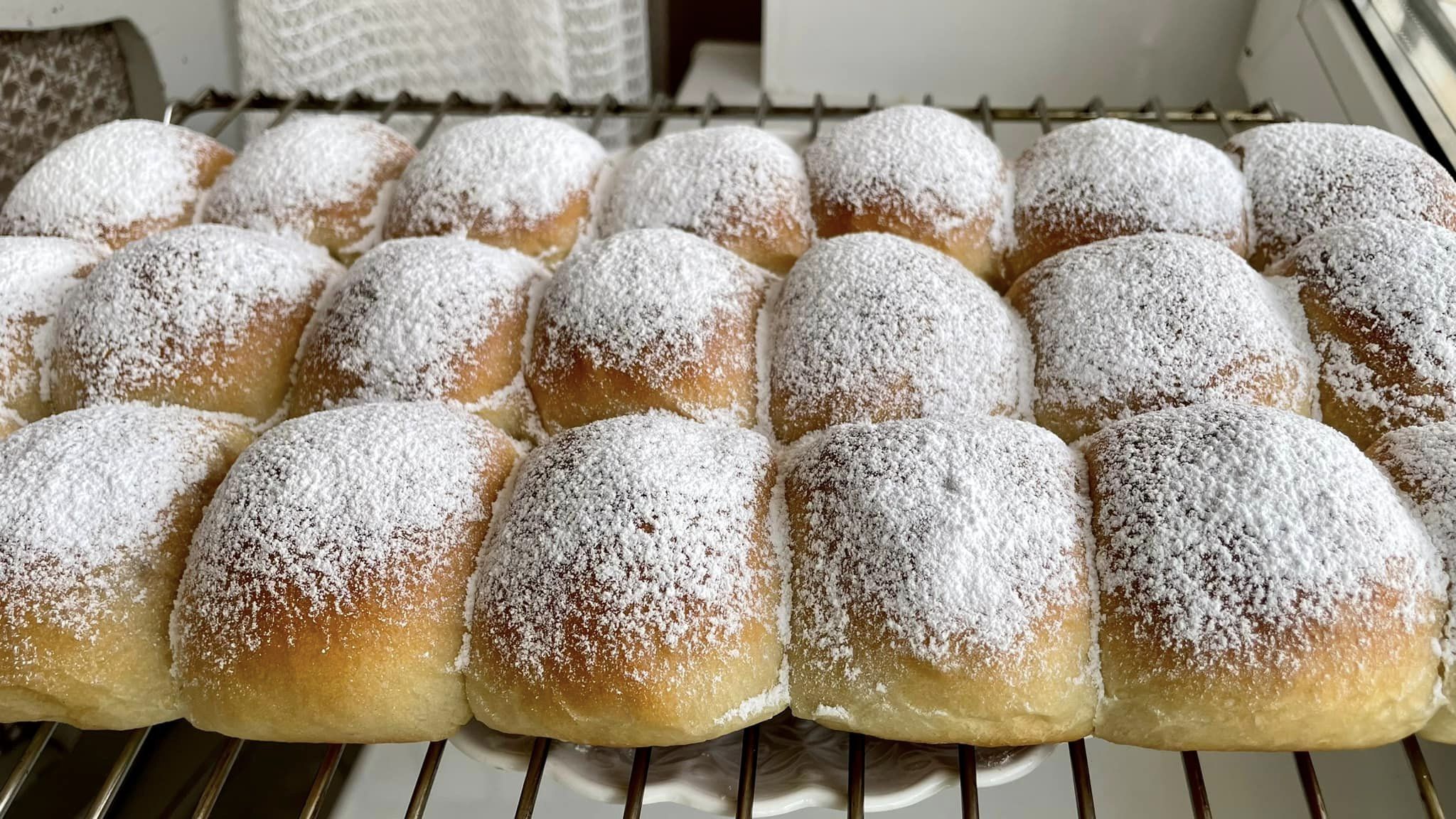 Ψήνω σε φούρνο προθερμασμένο στους 200°C για περίπου 25 λεπτά, μέχρι να ροδίσουν. Αλείφω τα έτοιμα αφράτα ψωμάκια με βούτυρο, αν και μπορώ να τα αφήσω και χωρίς. Τέλος, τα πασπαλίζω ελαφρά με ζάχαρη άχνη.