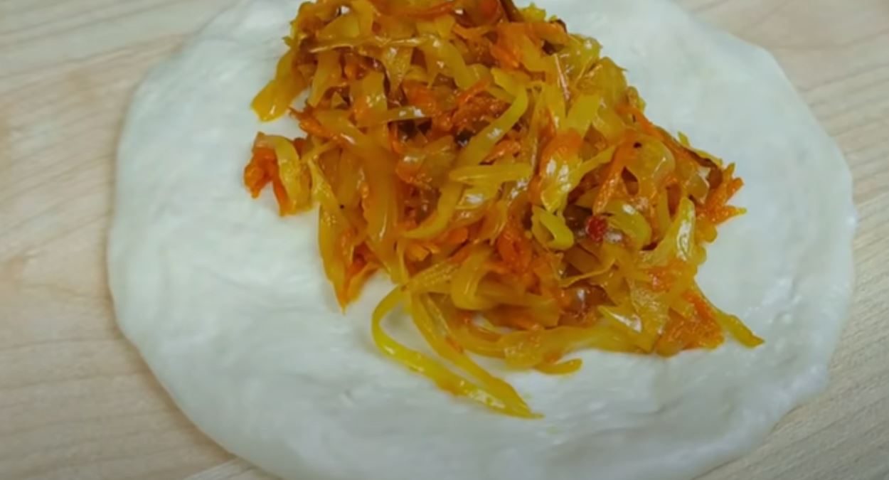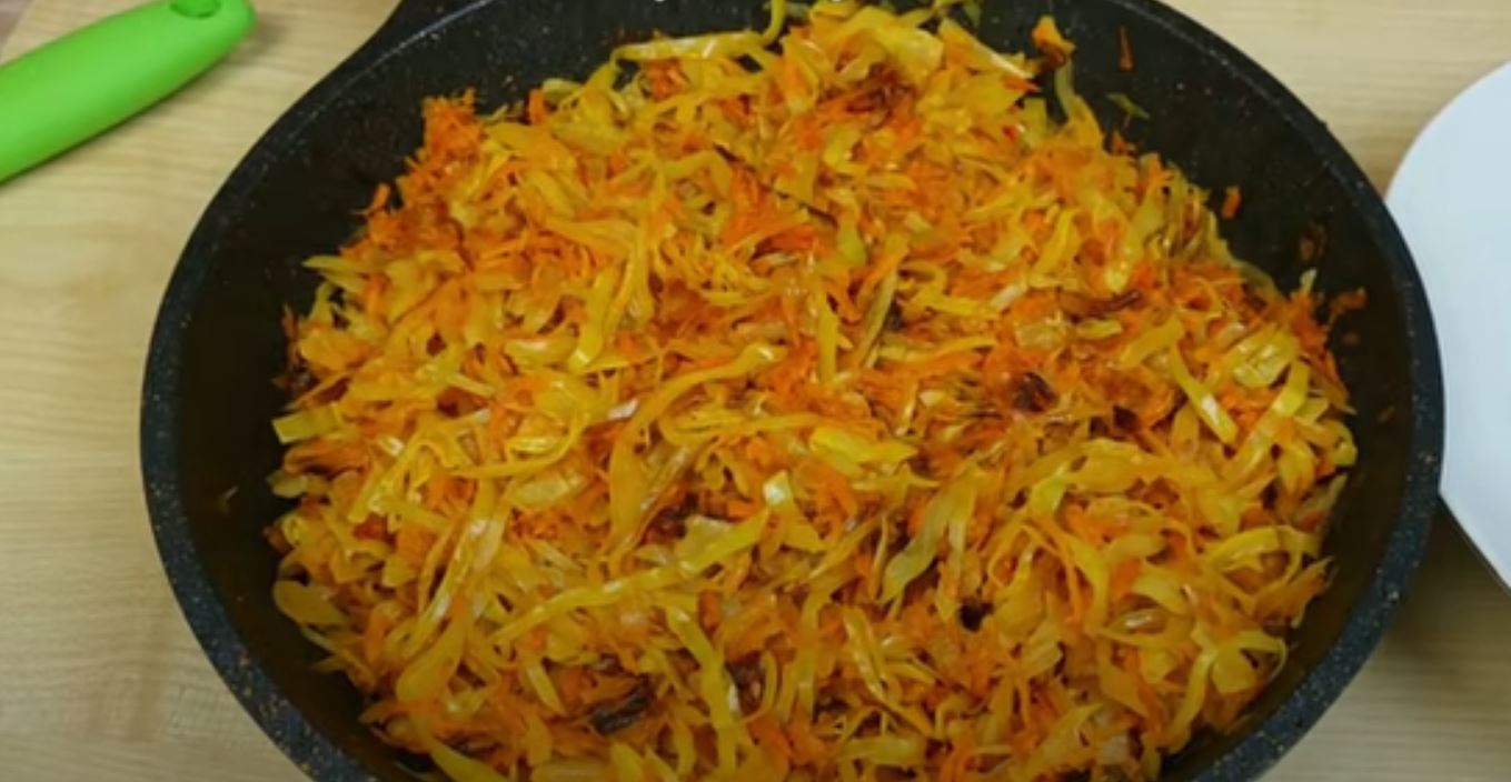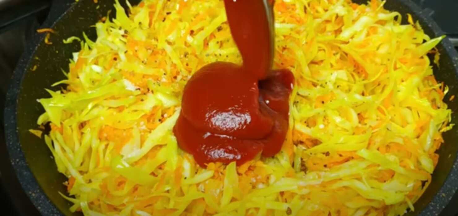 Βάζουμε ένα τηγάνι με λίγο λάδι σε μέτρια φωτιά προσθέτουμε το κρεμμύδι, τηγανίζουμε για 1 λεπτό, προσθέτουμε καρότα και συνεχίζουμε ανακατεύοντας για περίπου 4 ακόμη λεπτά, προσθέστε λάχανο, ανακατέψτε και συνεχίστε με ανοιχτό καπάκι για άλλα 5 λεπτά το λάχανο. Ρίχνω αλάτι και πιπέρι και 2 κουταλιές της σούπας σάλτσα ντομάτας,