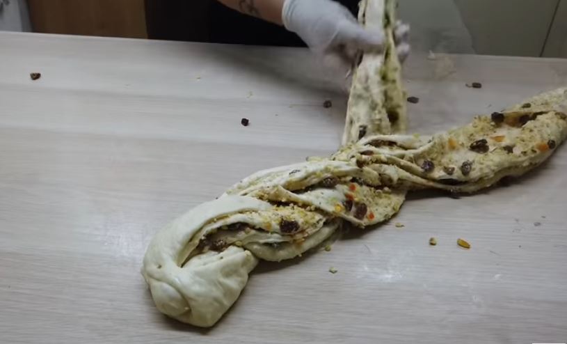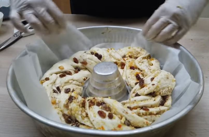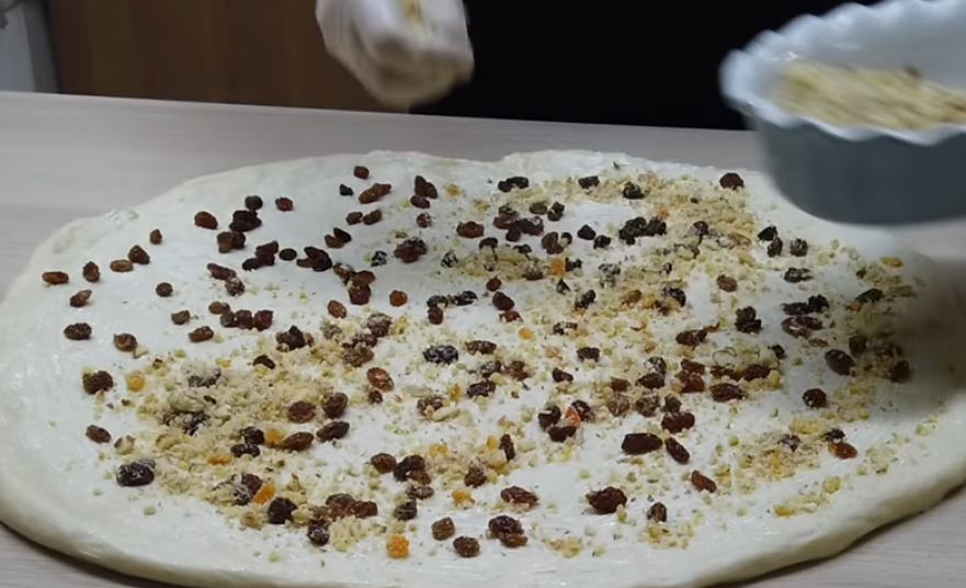 Παίρνουμε τις σταφίδες τις στύβουμε με το χέρι και απλώνουμε πάνω στην ζύμη.